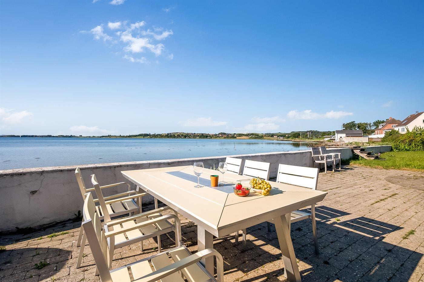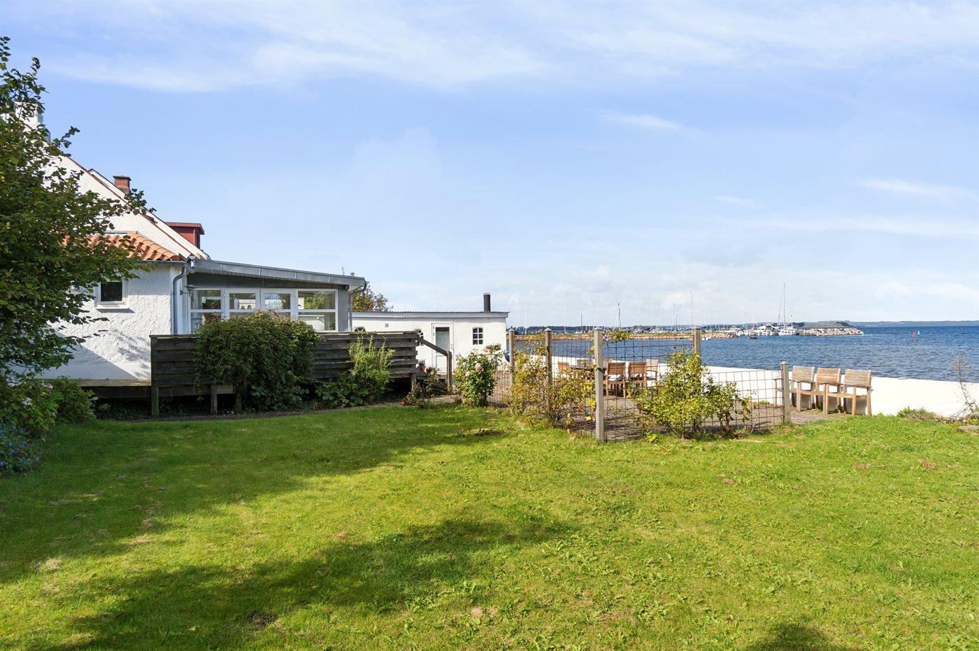 Nyistandsat sommerhus i Knebel med direkte udsigt til Århus Bugt og havet kun 5 m væk.