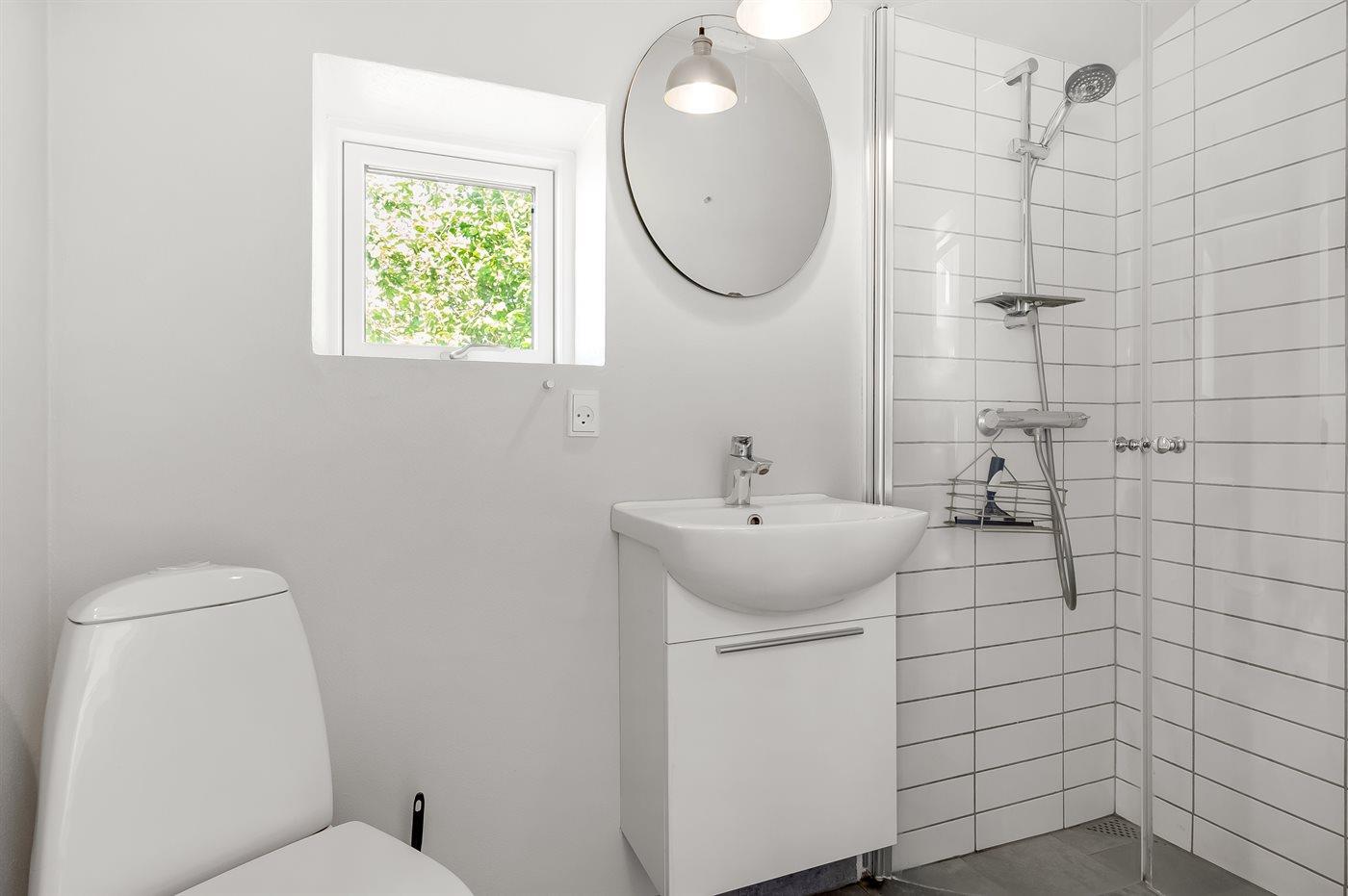 Der er 2 badeværelser med bruseniche og 2 toiletter. Der er gulvvarme på 1 badeværelse.. Badekar.