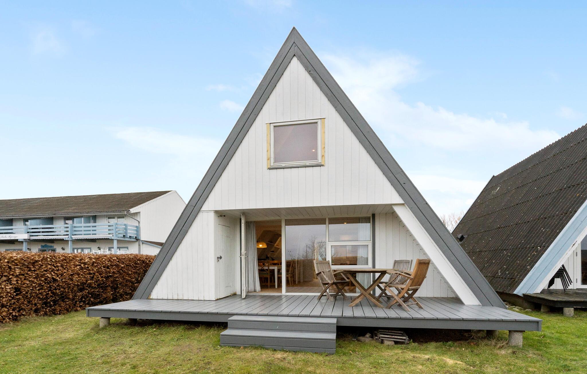 Hyggeligt træhus i børnevenligt feriecenter nær Nationalpark Mols Bjerge med fælles pool og legeplads.