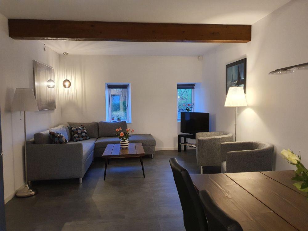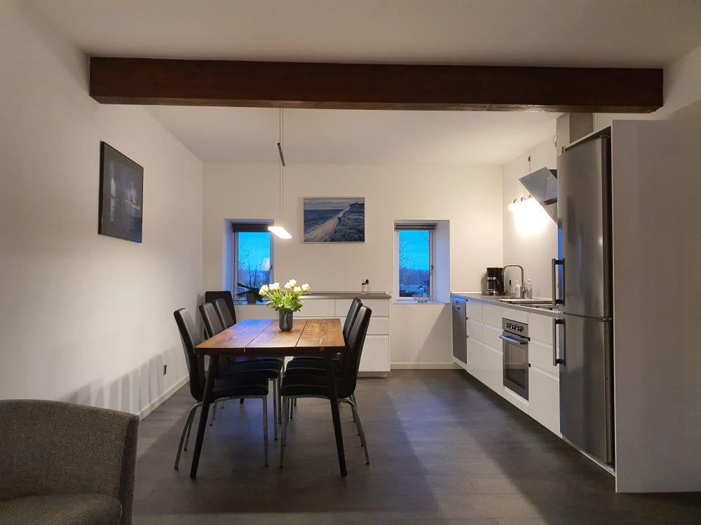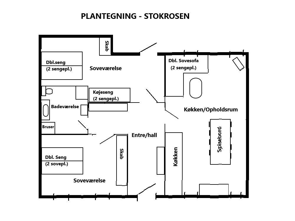 Lejlighed Stokrosen til 8 personer - gårdens største, herunder kæmpe terrasseareal. Lejligheden har egen indgang fra egen terrasse, soveværelser, kombineret ophold/spise/køkkenrum, eget bad med bruseniche og vaskemaskine samt eget køkken med stort køle-fryseskab, ovn, induktionskogeplade samt opvaskemaskine. Derudover er der gratis wifi til rådighed samt TV, så du via din smartphone kan streame dine egne TV kanaler over på TV'et. Lejligheden er på i alt 77 kvm fordelt på entre, bad, soveværelse med 4 sovepladser fordelt på dobbeltseng og køjeseng, endnu et soveværelse med 2 sovepladser i dobbeltseng samt opholdsrum med 2 sovepladser på sovesofa, spiseplads og køkken. Opholdsrummet har vinduer mod nord (parkeringsplads) og mod syd (gårdsplads). Med til lejen hører forbrug af el og vand, slutrengøring samt sengelinned, håndklæder og viskestykker - alle tekstiler er OEKO-TEX STANDARD 100 mærkede.
