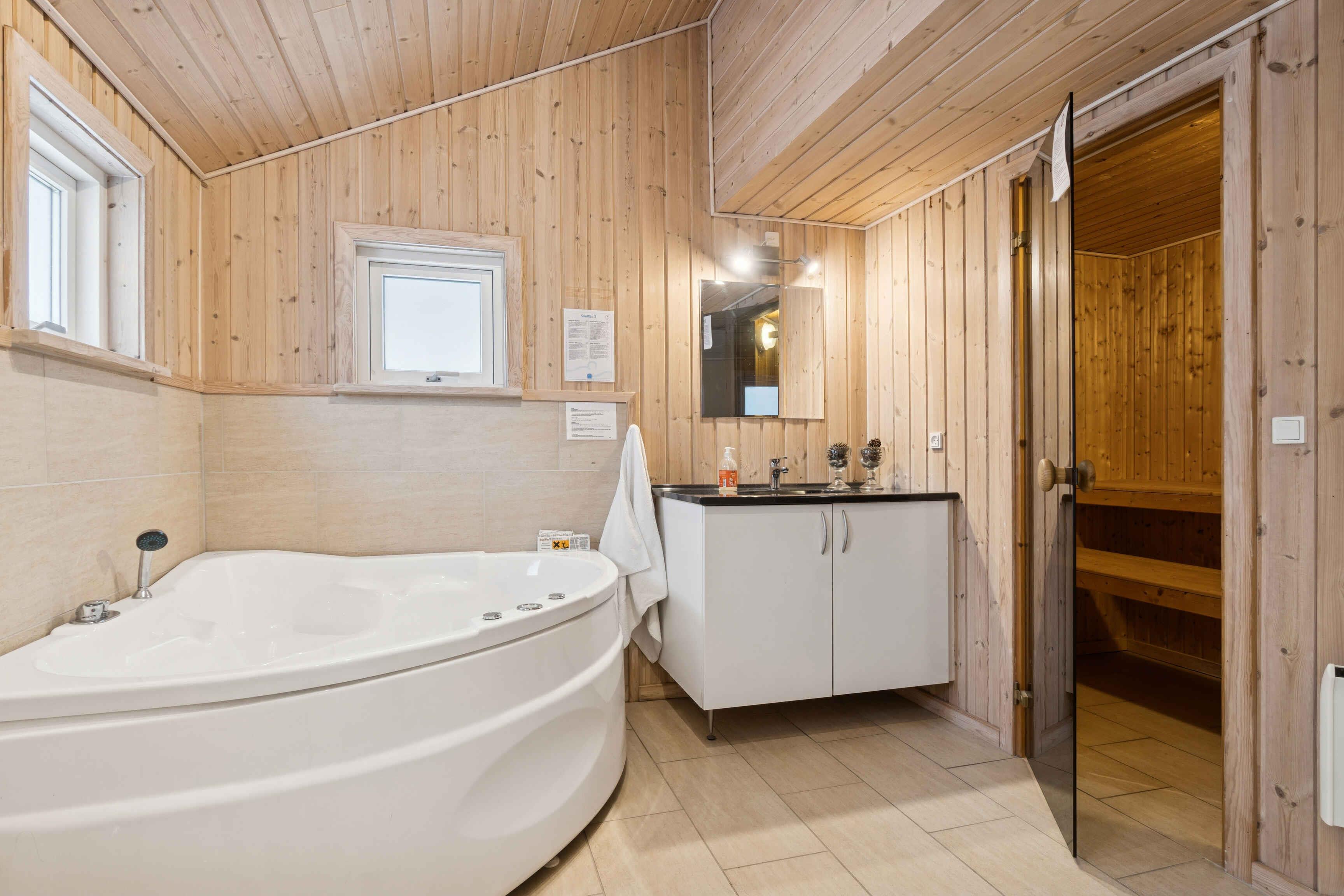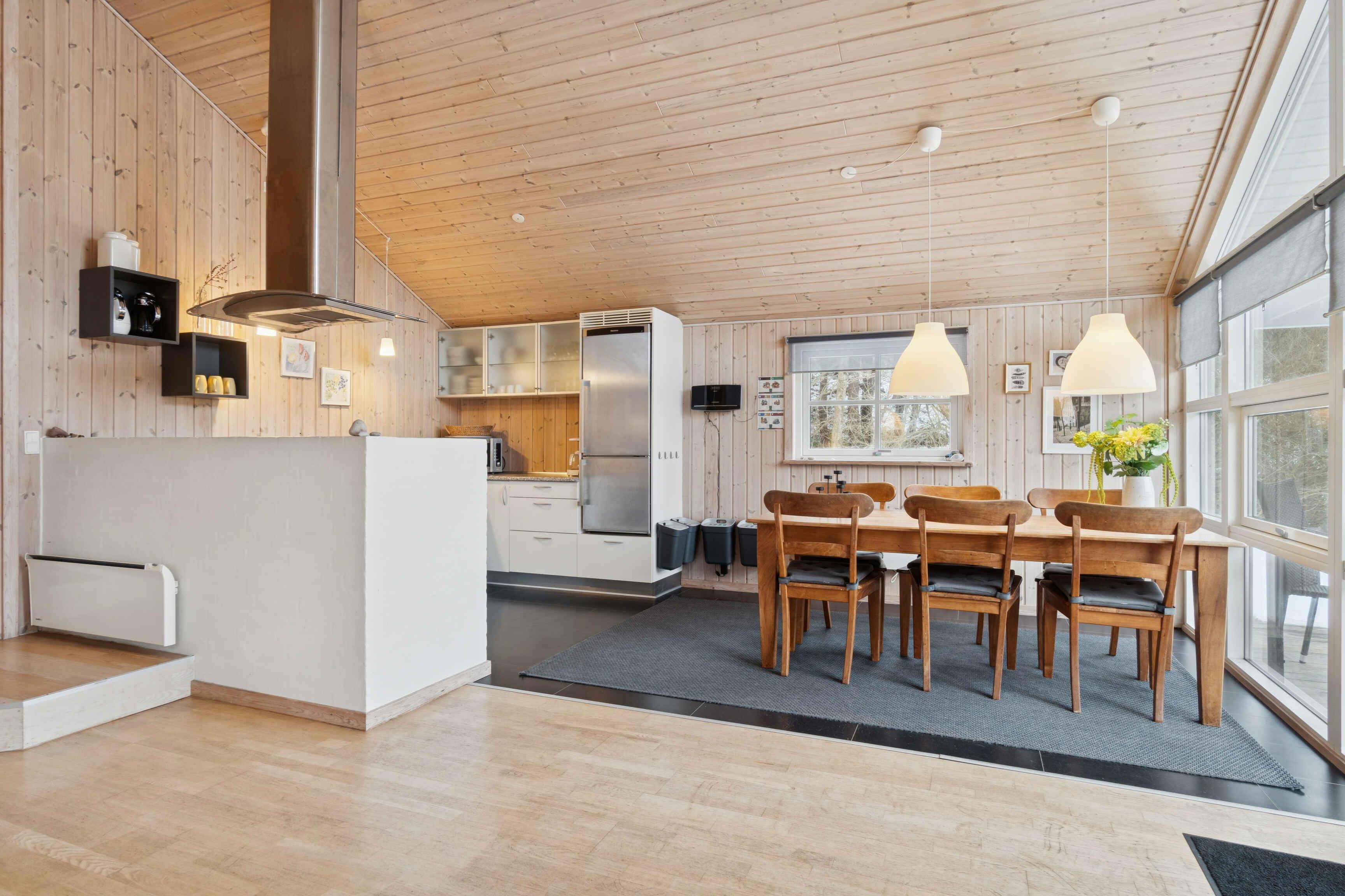 Moderne feriehus på 100 m² i forskudte plan med åbent køkken og overdækket terrasse. 3 soveværelser og rummelig hems. Flot badeværelse med spabad og sauna. Ligger ved lille sø og kun ca. 450 m til vandet.
