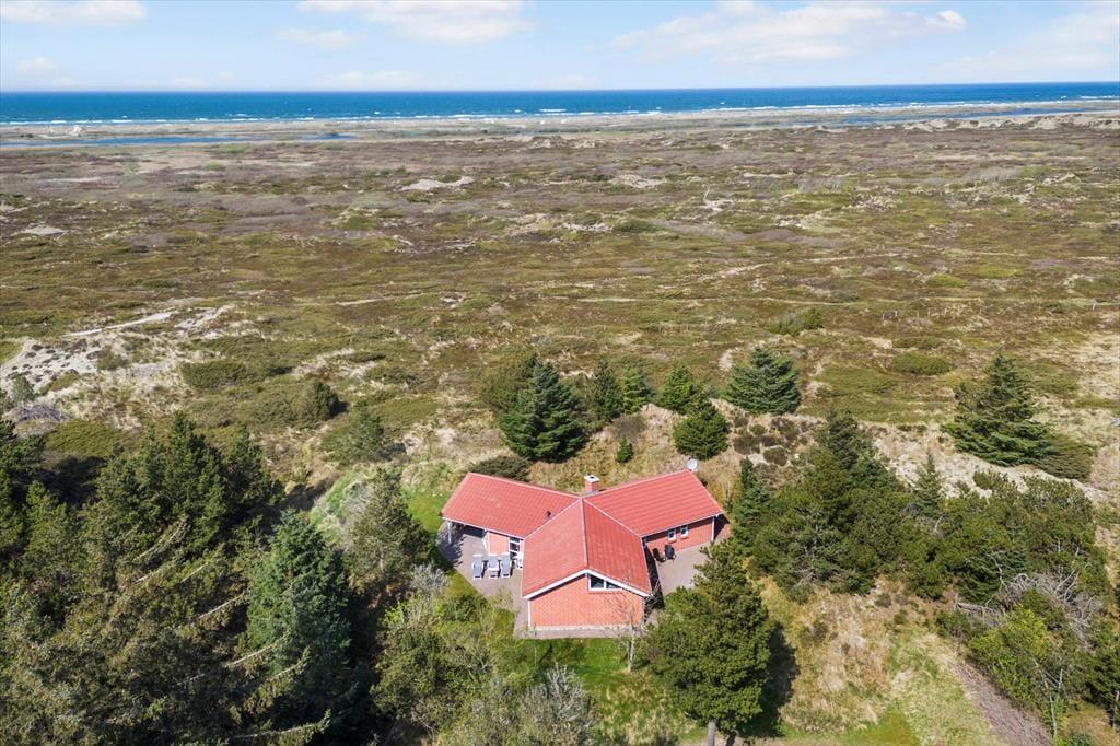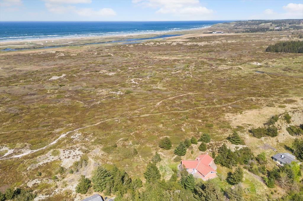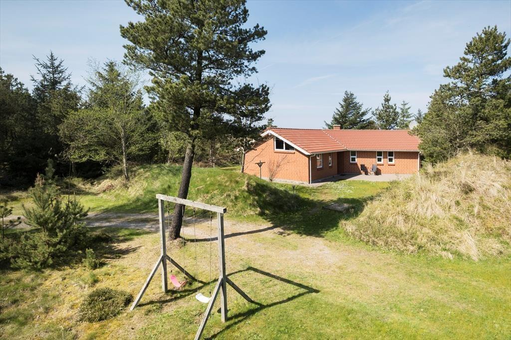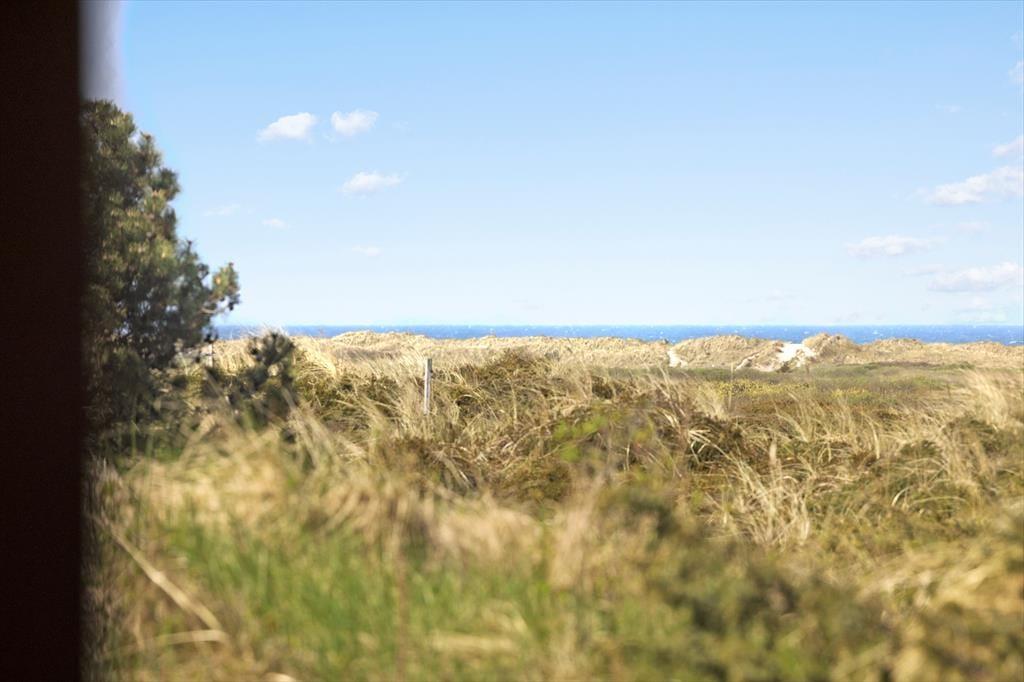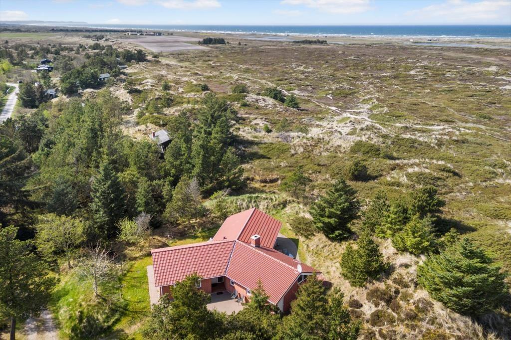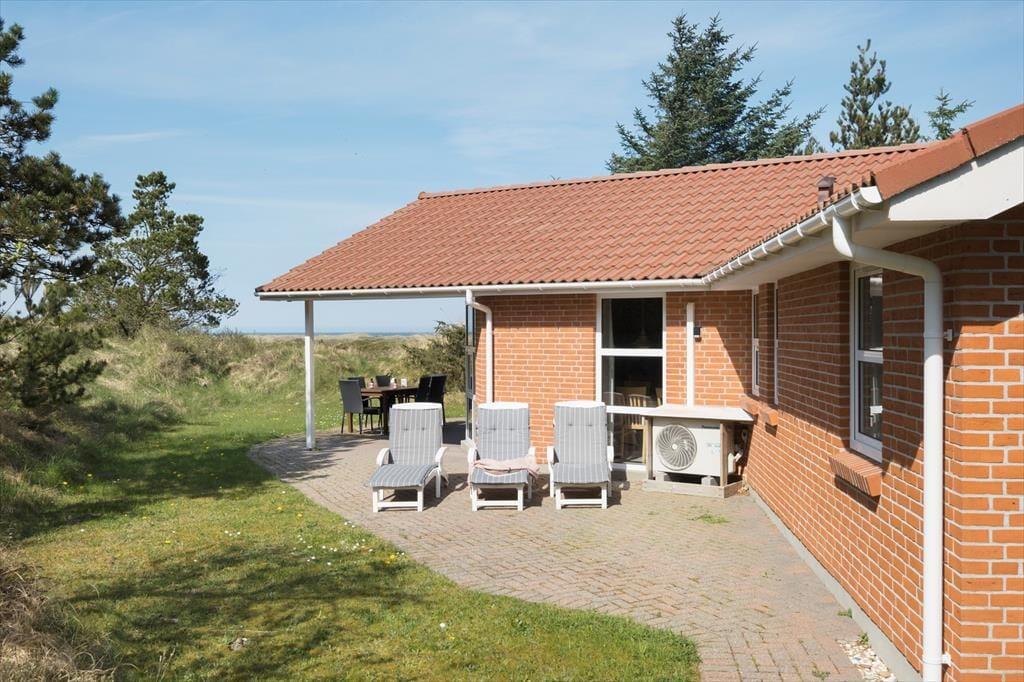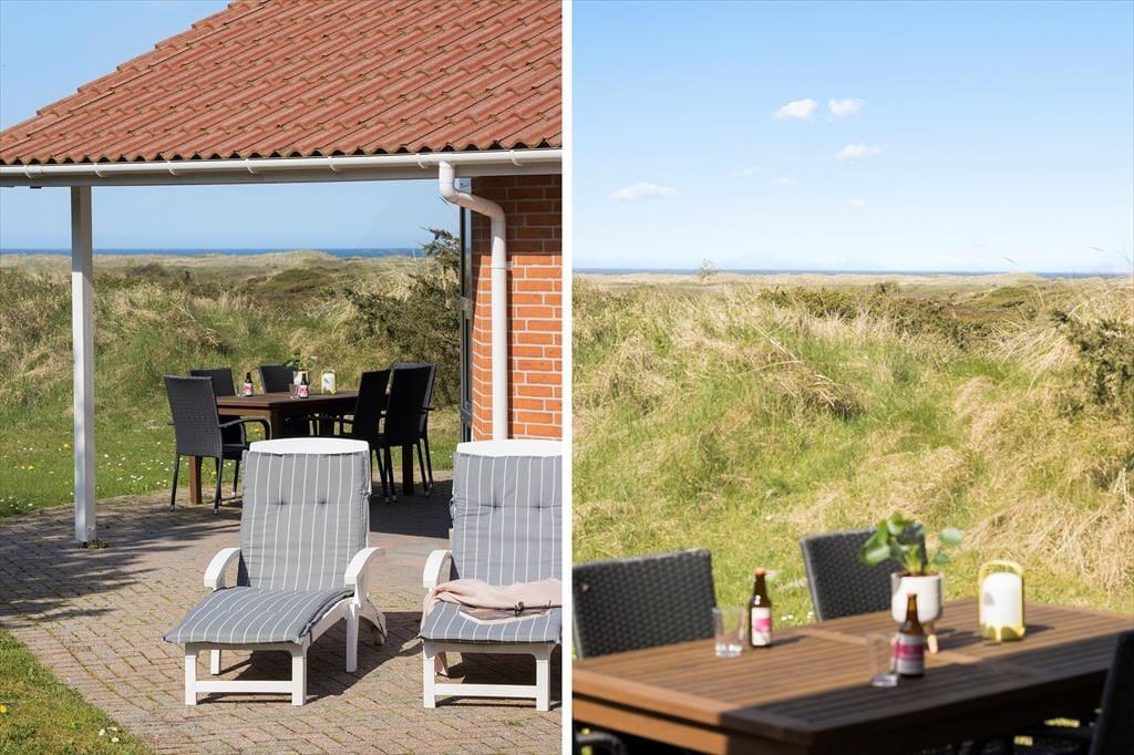Ved sommerhuset ligger hele fire terrasser, så man er sikker på til enhver tid at kunne finde en solplet i læ for Vestenvinden. Ud for stuen er terrassen overdækket og her kan man sidde tørt og lunt og nyde de lange sommeraftener. Fra den store grund, som er fyldt med små klitter og marehalm, kan man kigge til Vesterhavet i det fjerne.