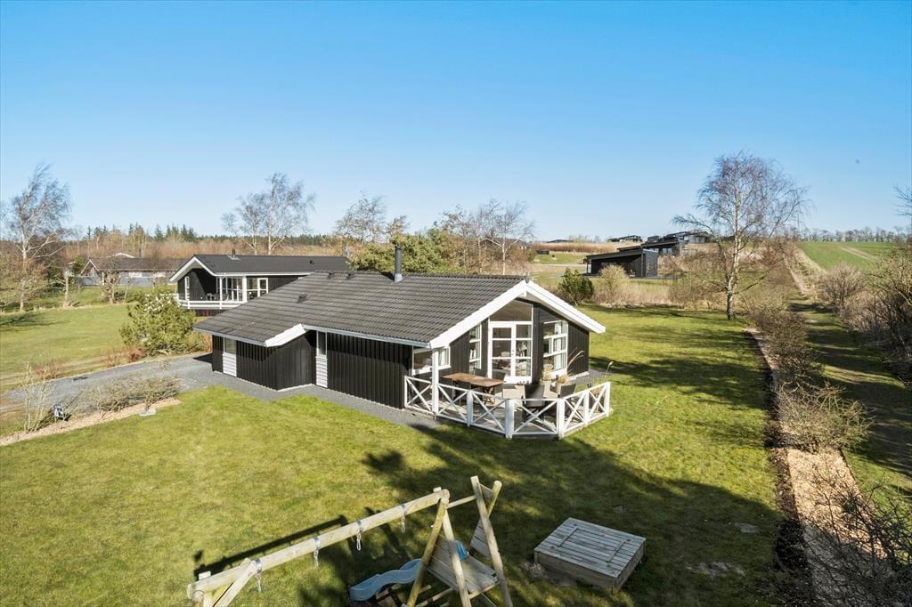 Udenfor fortsætter fortællingen om nærvær og ferieliv. Terrasserne er smukt indrettet, så du både kan synke ned i en stol med morgenkaffen og senere samle familien til måltider under åben himmel. Den store grund giver god plads til leg og afslapning – og de yngste kan glæde sig over gynge, der bliver et naturligt samlingspunkt i haven.