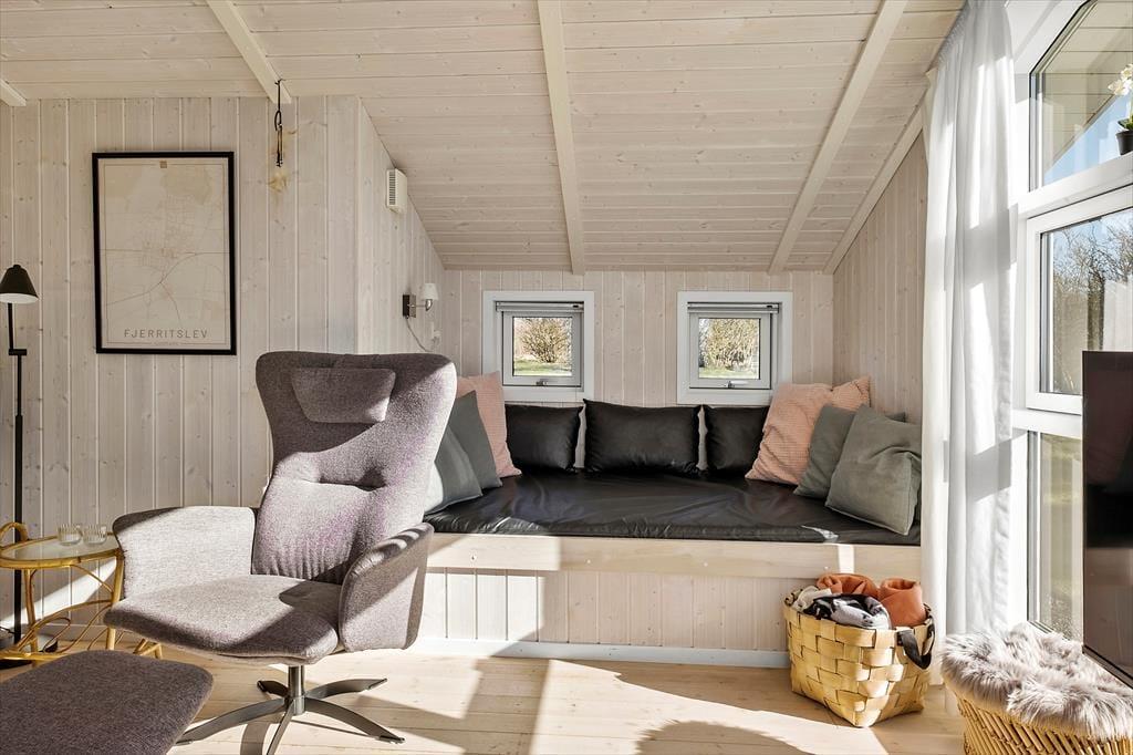 Når du træder ind i huset, mødes du af et lyst og venligt rum, hvor store vinduer lader naturen glide med helt ind i stuen. Her er hyggen i centrum – brændeovnen knitrer i baggrunden, og familiens samlingssted inviterer til spil, fortællinger og rolige stunder.
