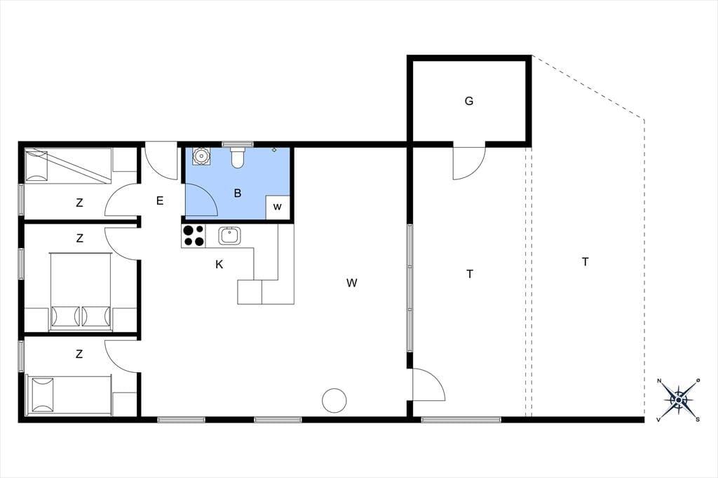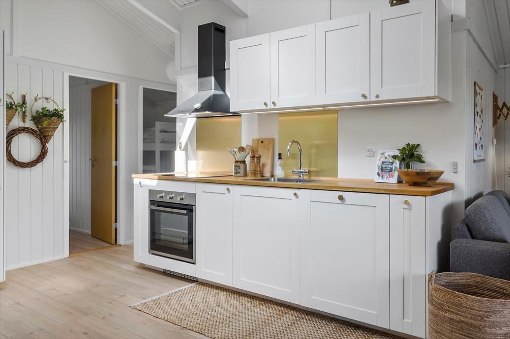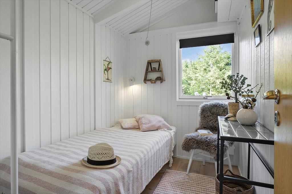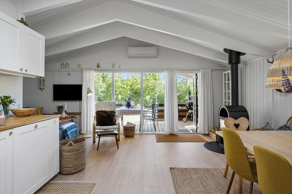 Huset, som er opført i 1979, er et ganske klassisk træsommerhus set udefra. Inden døre er mange af de typiske sommerhustræk også bevaret – og samtidig er det tydeligt at se, at rummene er blevet omsorgsfuldt moderniseret. Renoveringen er sket i 2019, så i dag er her et vellykket miks af komfortable møbler, moderne design og charmerende retro-detaljer. Planløsningen byder på et badeværelse og tre soveværelser, som i alt kan rumme fem overnattende gæster. Husets samlingspunkt er en dejlig stue med loft til kip, brændeovn og store vinduespartier, så I får glæde af dagslyset og havens grønne omgivelser. I stuen er et flot køkken integreret, hvor I kan hygge jer med at gøre klar til brunch og dagens øvrige feriemåltider.