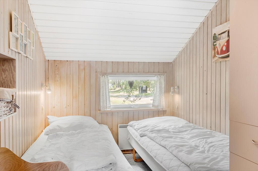 Det 84 m2 store og hyggelige træsommerhus er blevet renoveret i 2021, hvilket blandt andet kan ses på den flotte og rummelige køkkenafdeling, der udgør den ene ende af opholdsrummet. I den anden ende af rummet er der sofa, brændeovn og fladskærms-tv, så her er der lagt op til masser af hyggestunder i komfortable rammer. Et pænt badeværelse med bruser og vaskemaskine hører også med til planløsningen, og endelig er der tre soveværelser, hvoraf det ene er med dobbeltseng og de to andre med hver især to enkeltsenge.