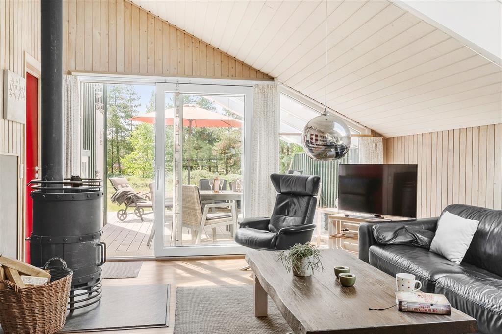 I kan nyde synet af den 2600 m2 store naturgrund inde fra sommerhuset, og når I træder ud på terrassen, bliver alle sanser vækket. Der lufter af lyng og anden vild beplantning, mens fuglene kvidrer fra trætoppene, og uanset om I mærker en mild brise eller solens varmende stråler, er det nemt at finde en god opholdsplads. Der er nemlig flere opholdspladser at vælge imellem, inklusiv en delvist overdækket træterrasse, og til børnene er der gynger og sandkasse.