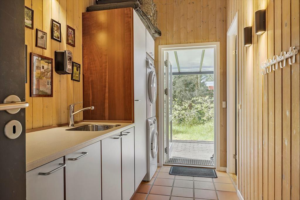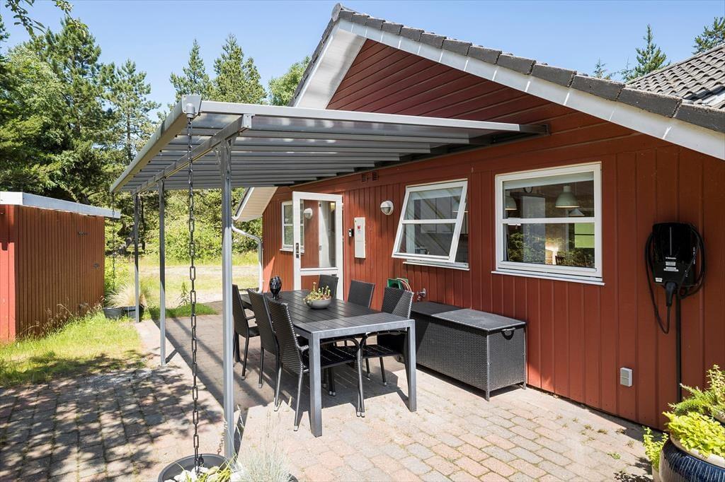 På den 2650 m2 store naturgrund er der afskærmende randbeplantning og en grusbelagt indkørsel, og en velanlagt græsplæne indbyder til vandkamp, frisbee og fodbold. Børnene kan også hygge sig med at gynge, rutsje og lege i den bådformede sandkasse, og når I alle vil samles til en god frokost eller et lækkert aftensmåltid tilberedt på grillen, kan I slå jer ned på en af terrasserne. Flisebelægningen breder sig rundt om sommerhuset, så der er flere dejlige steder at sidde – inklusiv et overdækket areal, hvis du drømmer om at sidde længe ude om aftenen, mens tusmørket langsomt breder sig.