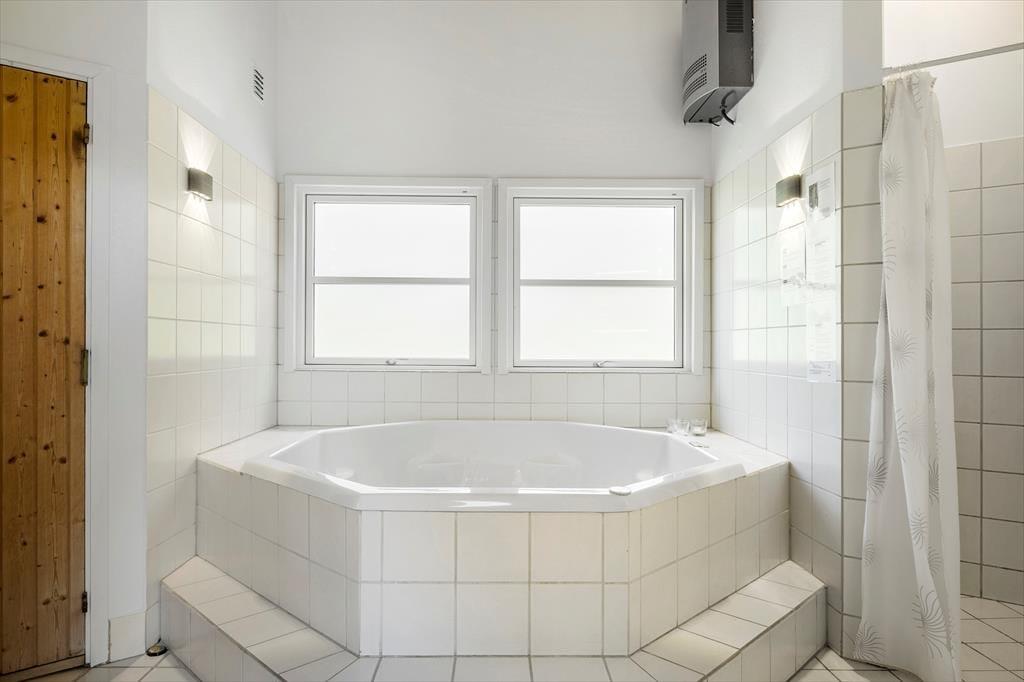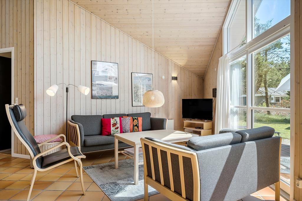 Ved første øjekast kunne sommerhuset se helt klassisk ud med sin rødmalede træfacade og sine hvide vinduer, men hvis du bemærker planløsningen, har det en atypisk femkantet form. Det har selvfølgelig også en effekt inden døre, hvor væggenes skæve vinkler og kiploftet giver rummene en særligt hyggelig atmosfære. Der er tre gode soveværelser med sengepladser til seks personer, og det største af de to badeværelser er på lækker vis udstyret med både spabad og sauna. Når du ikke kobler af her, er det herligt at sidde i stuen, der byder på en brændeovn, stilfuldt møblement og store vinduer, der inviterer generøse mængder af dagslys indenfor. Et tosidet køkken er integreret i rummet, så madlavningen kan nemt indgå i feriens fælles hyggeprojekter.