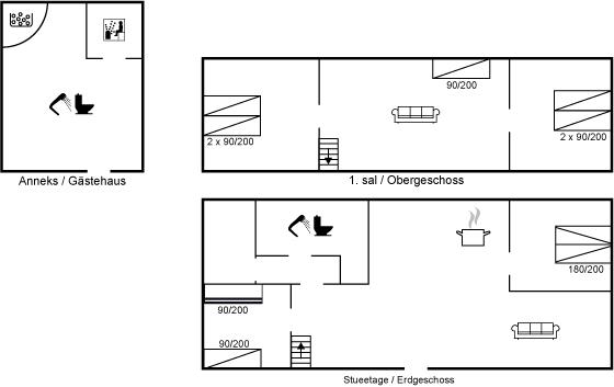 Der er i alt 5 soveværelser. Sovepladserne fordeler sig på: 6 sovepladser i dobbeltsenge. 2 sovepladser i enkeltsenge. 2 sovepladser i køjeseng. 2 sovepladser på madrasser. Derudover er der 1 stk. barneseng.