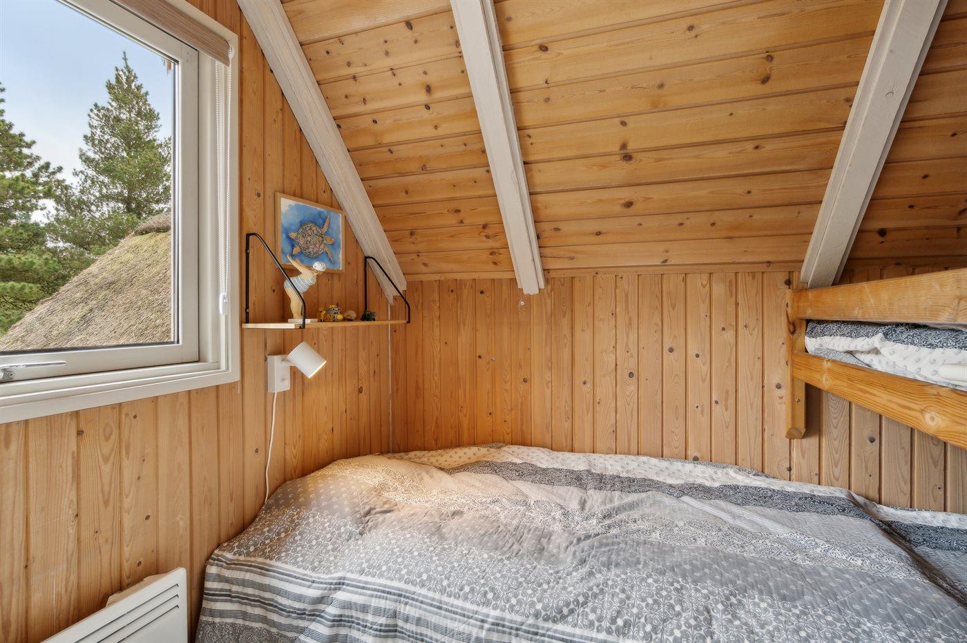 Dette stråtækte sommerhus i træ, bygget i 1987 og senest moderniseret i 2023, ligger på en stor, lyngklædt naturgrund i det dejlige område, Kongsmark. Til huset hører 2 store, åbne terrasser mod syd og vest med havemøbler og gode læmuligheder samt en overdækket terrasse.