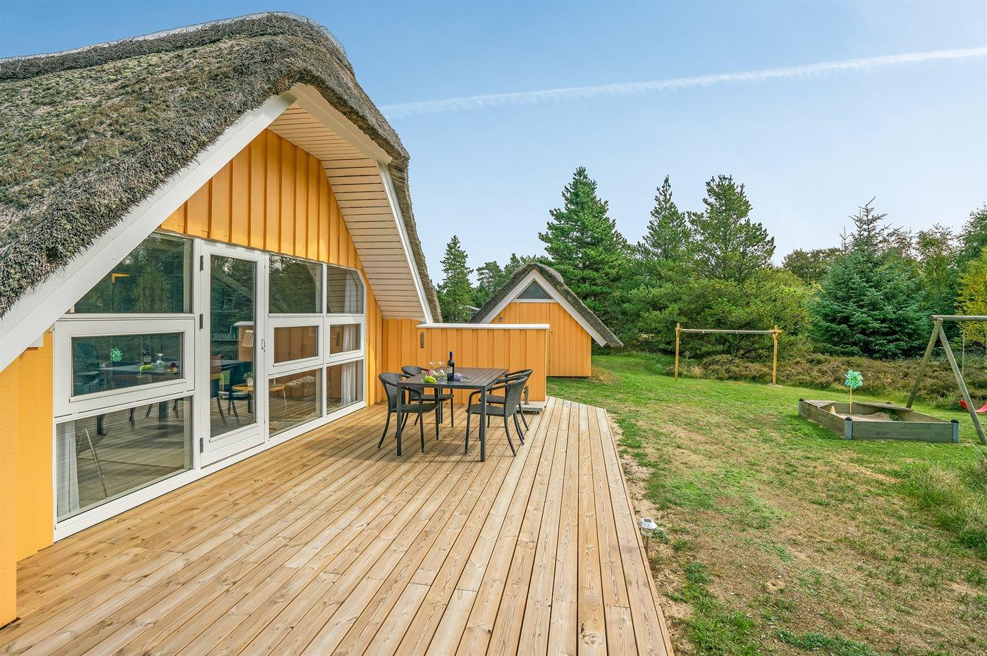 Hyggeligt stråtækt sommerhus i Kongsmark med sauna, spa og store terrasser på stor naturgrund.