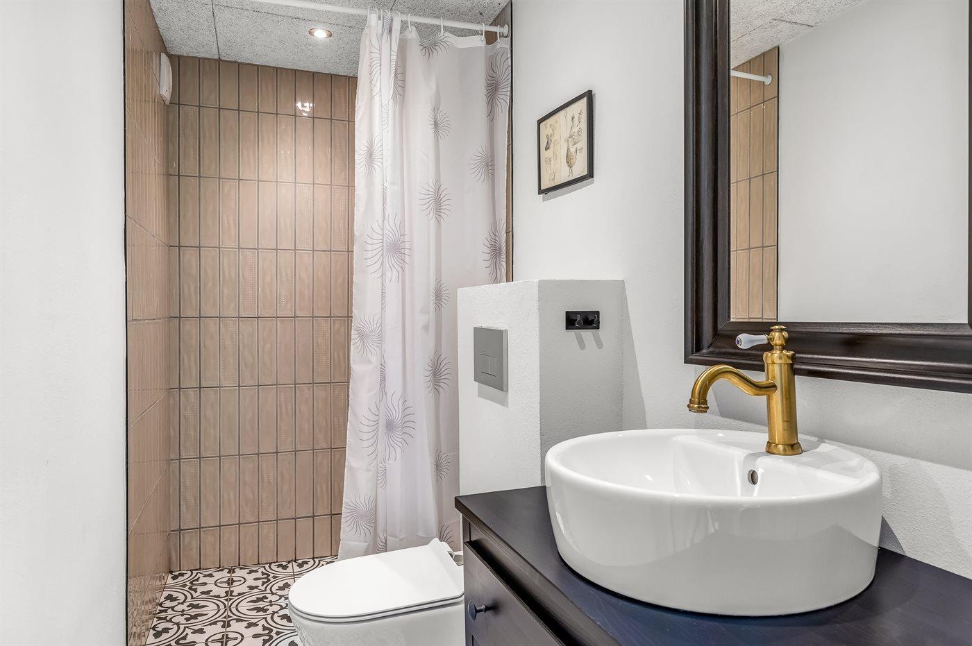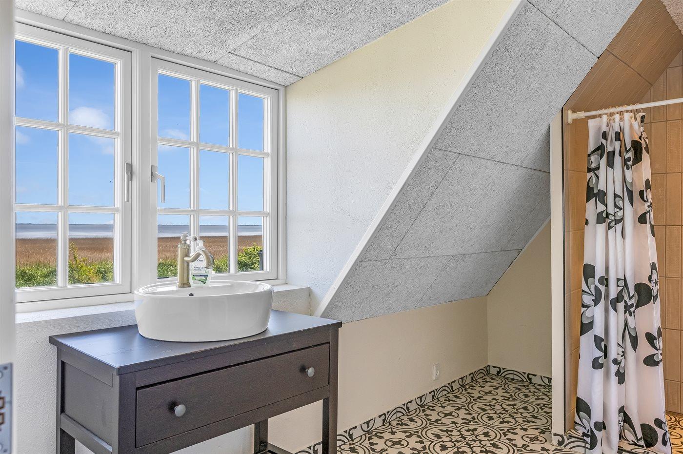 Der er 3 badeværelser med bruseniche og toilet, alle med gulvvarme. I det ene badeværelse der mulighed for afslapning i den tilstødende sauna.