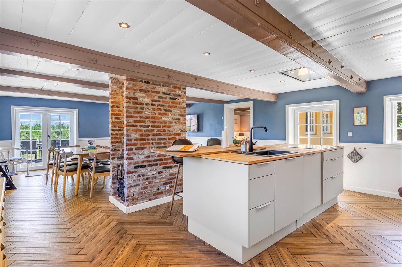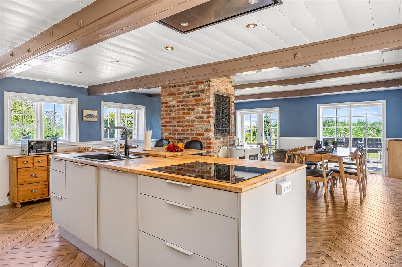 Køkkenet ligger i åben forbindelse med spisestuen og er udstyret med 2 køleskabe, 4 induktions-kogeplader, 2 varmluftovne, mikrobølgeovn samt opvaskemaskine. Ferieboligen har desuden vaskemaskine og tørretumbler samt fryser med kapacitet på 60 liter.