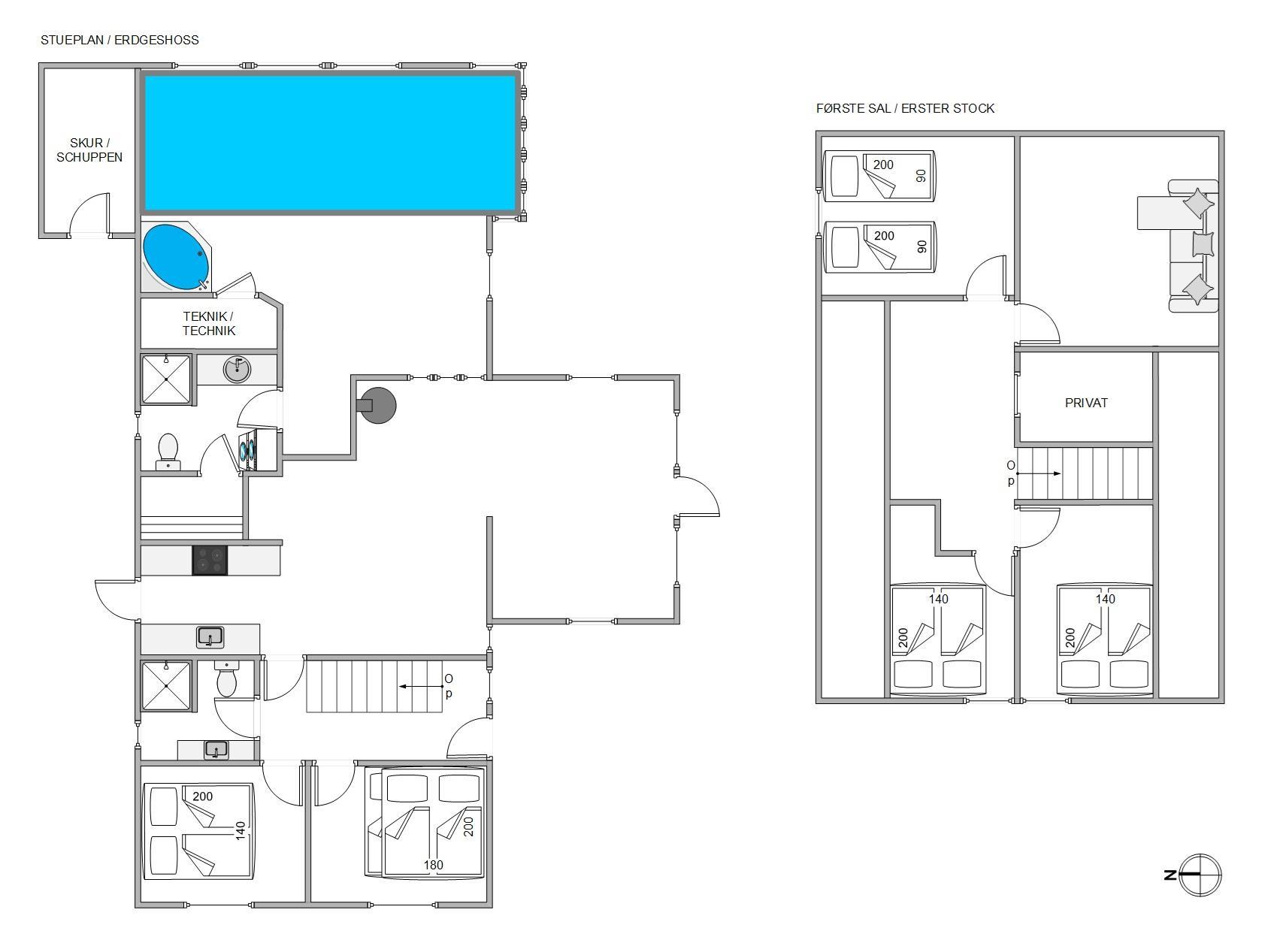 Poolhuset har 5 soveværelser, der alle er indrettet med dobbeltsenge med boksmadrasser samt vinterdyner, sommerdyner, puder og rullemadrasser. Det ene værelse i stueetagen har sågar en 180 cm bred dobbelt køjeseng med 4 boksmadrasser. I et af værelserne på 1. sal kan dobbeltsengen nemt adskilles til 2 enkeltsenge. På hvert værelse er der et Full HD LED TV med valgfri digitale kanaler. På det ene værelse endda et 40” Full HD LED Smart TV med Chromecast.