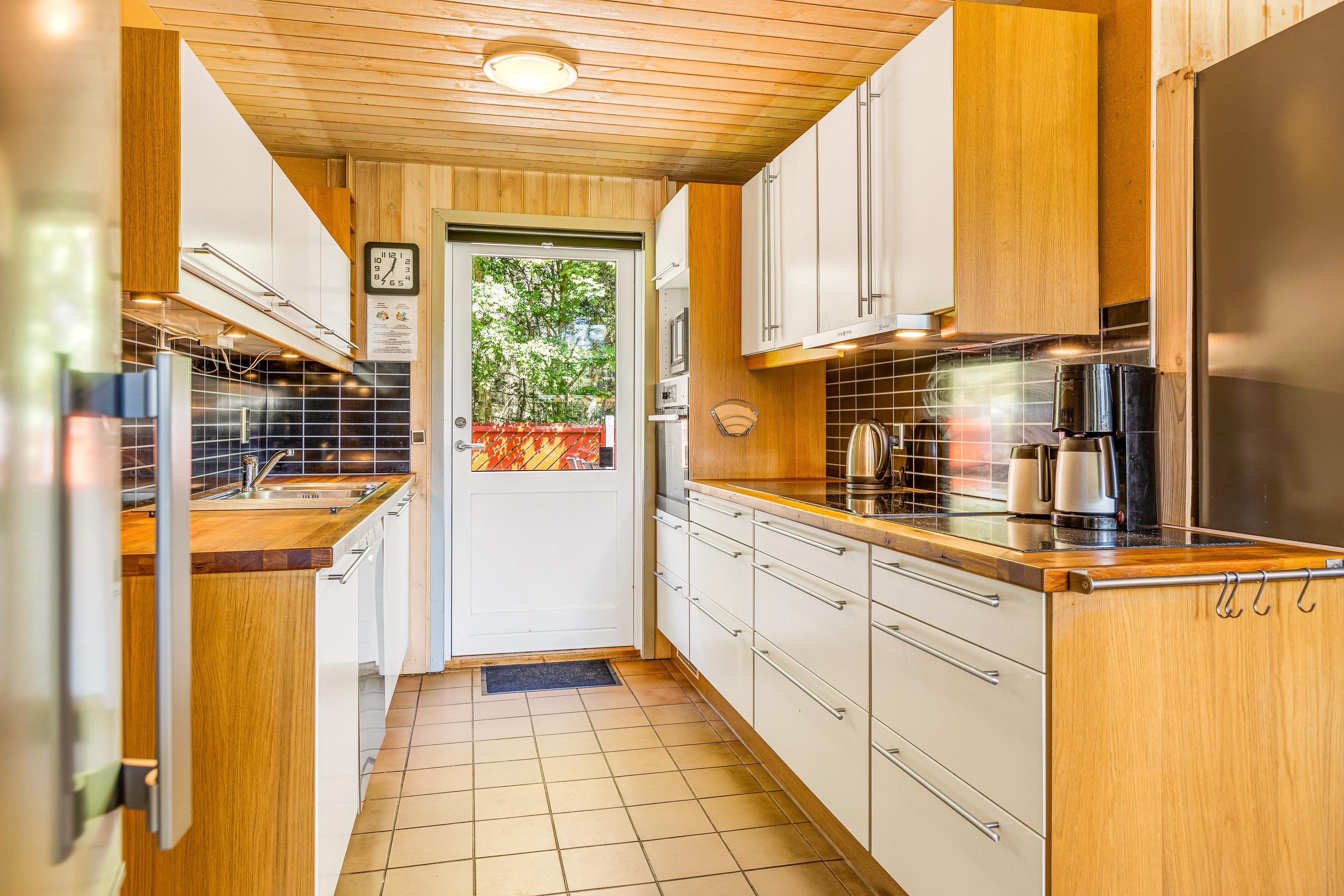 Det åbne køkken er praktisk kombineret med den store afskærmede spisestue. Flot, funktionelt køkken (2012) med god skabsplads, 2 nye selvafrimende køle-/fryseskabe med en samlet frysekapacitet på 190 liter, nyere varmluftsovn med grill og pyrolyse, nyere induktionskogeplader, 3-funktions mikrobølgeovn og opvaskemaskine.