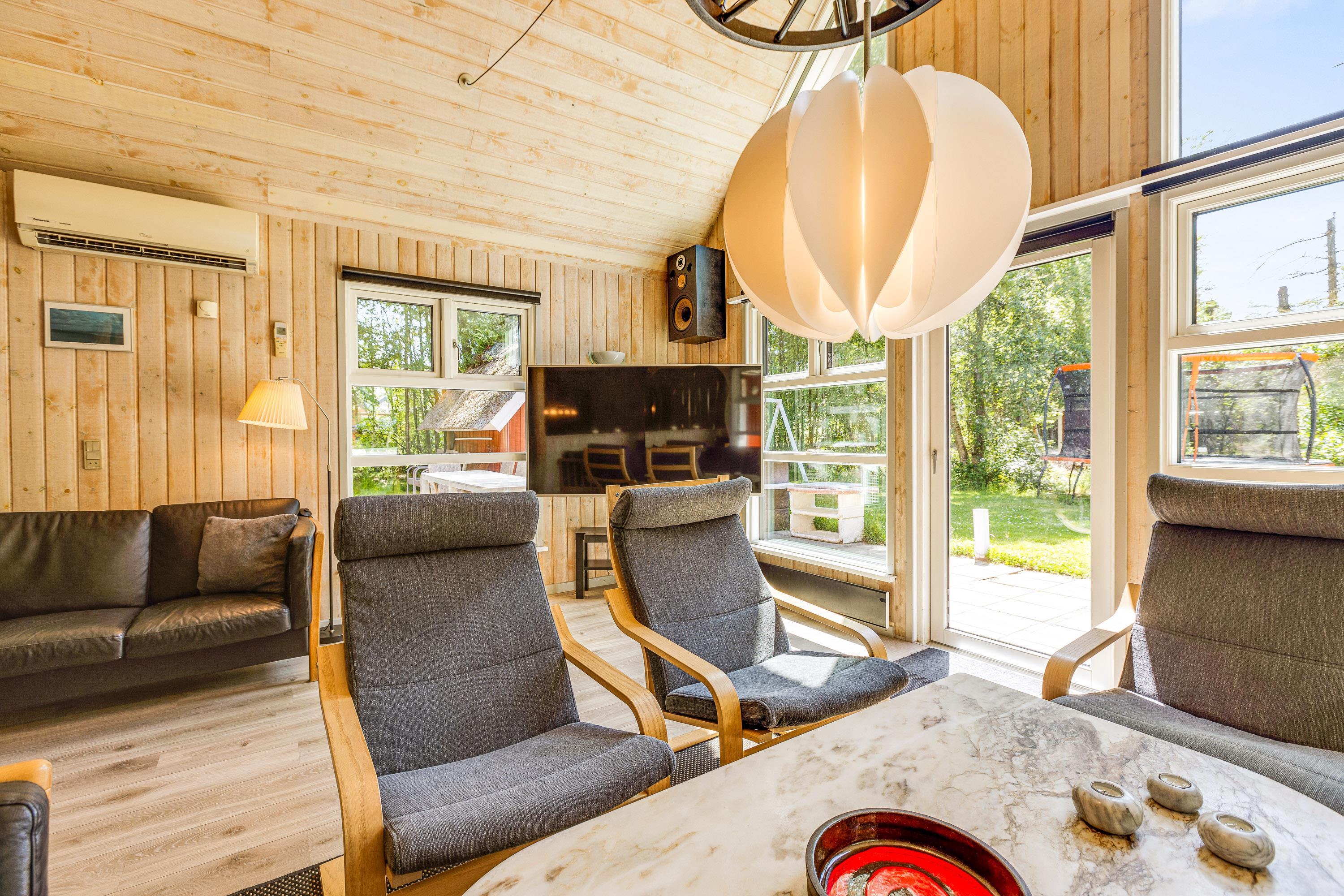 Husets smagfulde og elegante indretning er lyst og unikt udført i 2 plan og de to rummelige opholdsstuer har plads til alle husets gæster. En helt speciel arkitektur med panoramavinduer mod syd og loft til kip giver den ene stue på 44 m² et rummeligt, lyst og atmosfærefyldt præg. Stuen er indrettet med komfortable lædermøbler, 70” 4K UHD LED Smart TV med Chromecast, 5.1 surround sound med Bluetooth, parabol, Blu-Ray afspiller, stereoanlæg med CD-afspiller, trådløse opladere til smartphones samt en effektiv brændeovn. En kraftig varmepumpe sikrer energivenlig opvarmning af hele boligen om vinteren og aircondition om sommeren. Fra stuen er der gennem et bredt glasparti et godt overblik over den 25 m² store pool.