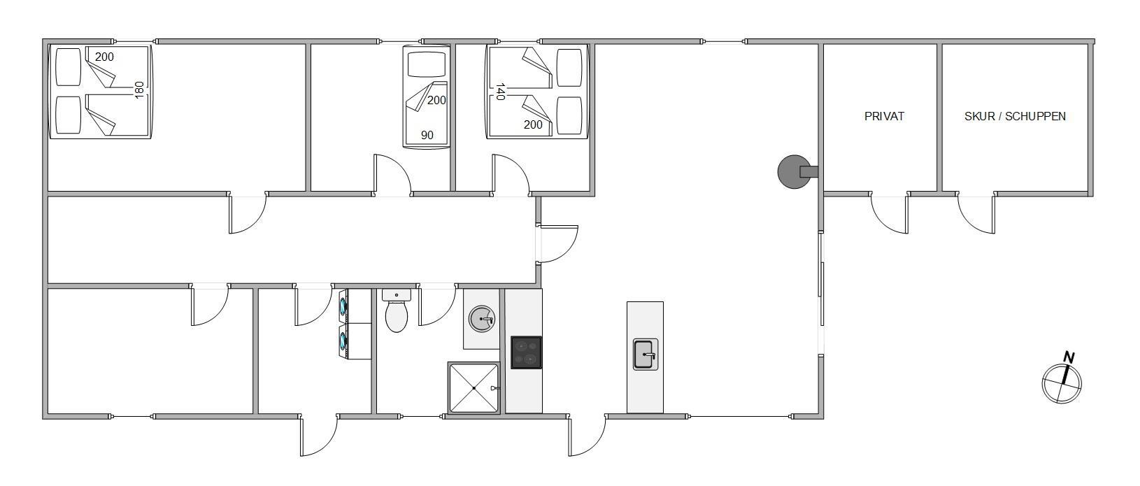Udover det hyggelige alrum, byder feriehuset på et fint badeværelse, et lille bryggers med vaskemaskine og fire værelser. Ligesom i stuen er der også gulvtæpper på værelserne. To værelser er indrettet med dobbeltseng, ét værelse med en enkeltseng og det sidste med en sovesofa.