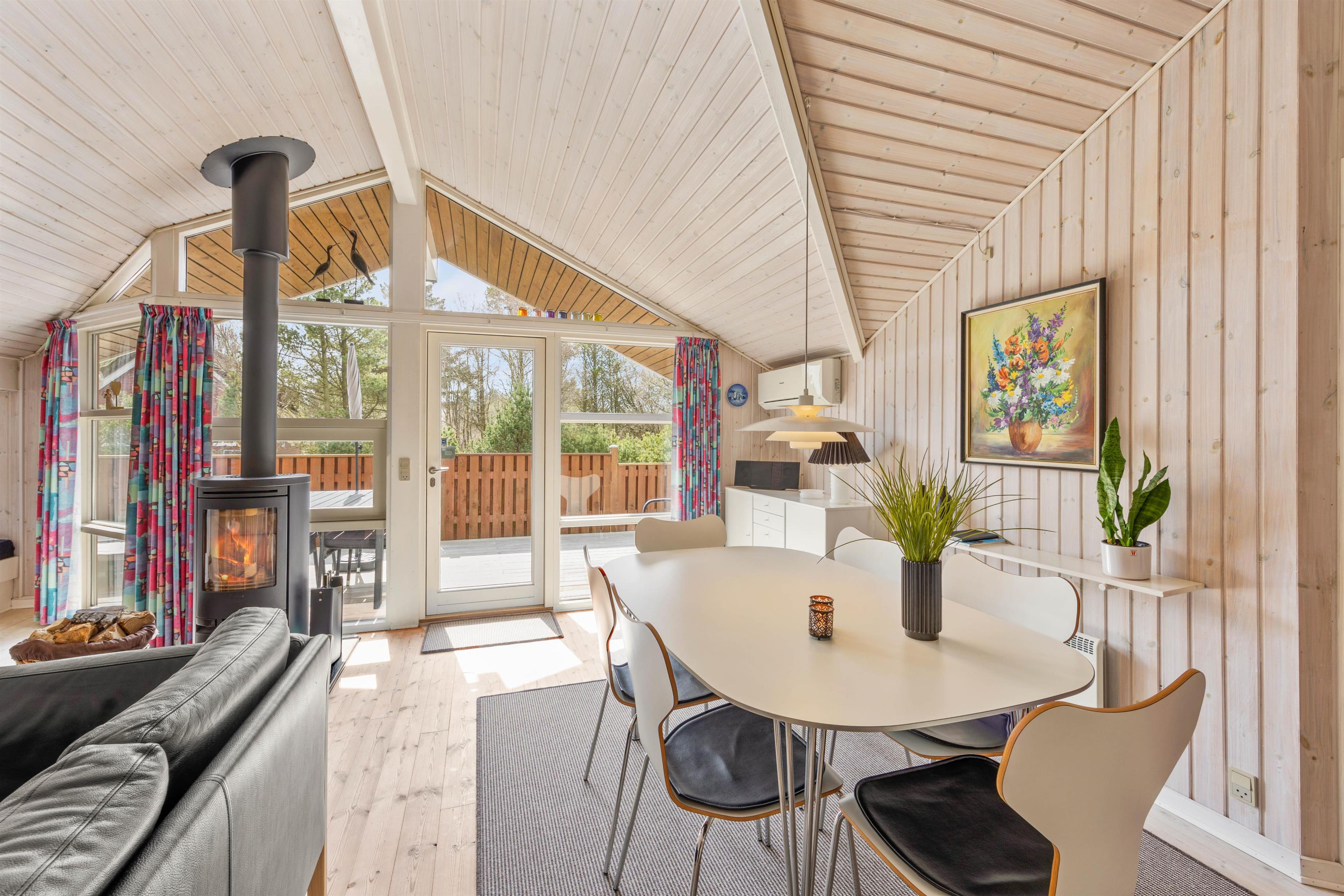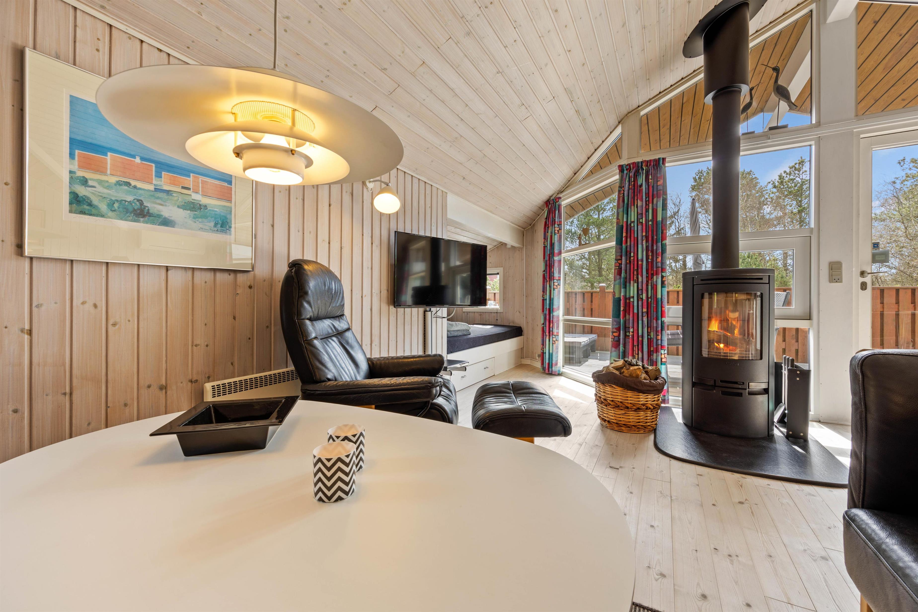 Det lille køkken, med gulvvarme, er åbent i forbindelse med spiseplads og sofagruppe. Her er alt, hvad I behøver for at tilberede lækre måltider, hygge jer foran brændeovnen ved spisebordet eller i sofaen med en god bog og en kop kaffe. Her er endda en alkove, hvis du får brug for et hvil midt på dagen. Sommerhusets mange vinkler og kroge i sammensætning med de lyse, træbeklædte vægge og lofter op i kip giver luft, hygge og feriestemning. På kølige dage eller mørke aftener er det nærliggende at tænde op i brændeovnen, lægge fødderne op og hygge sig sammen om et spil yatzy og et glas vin.