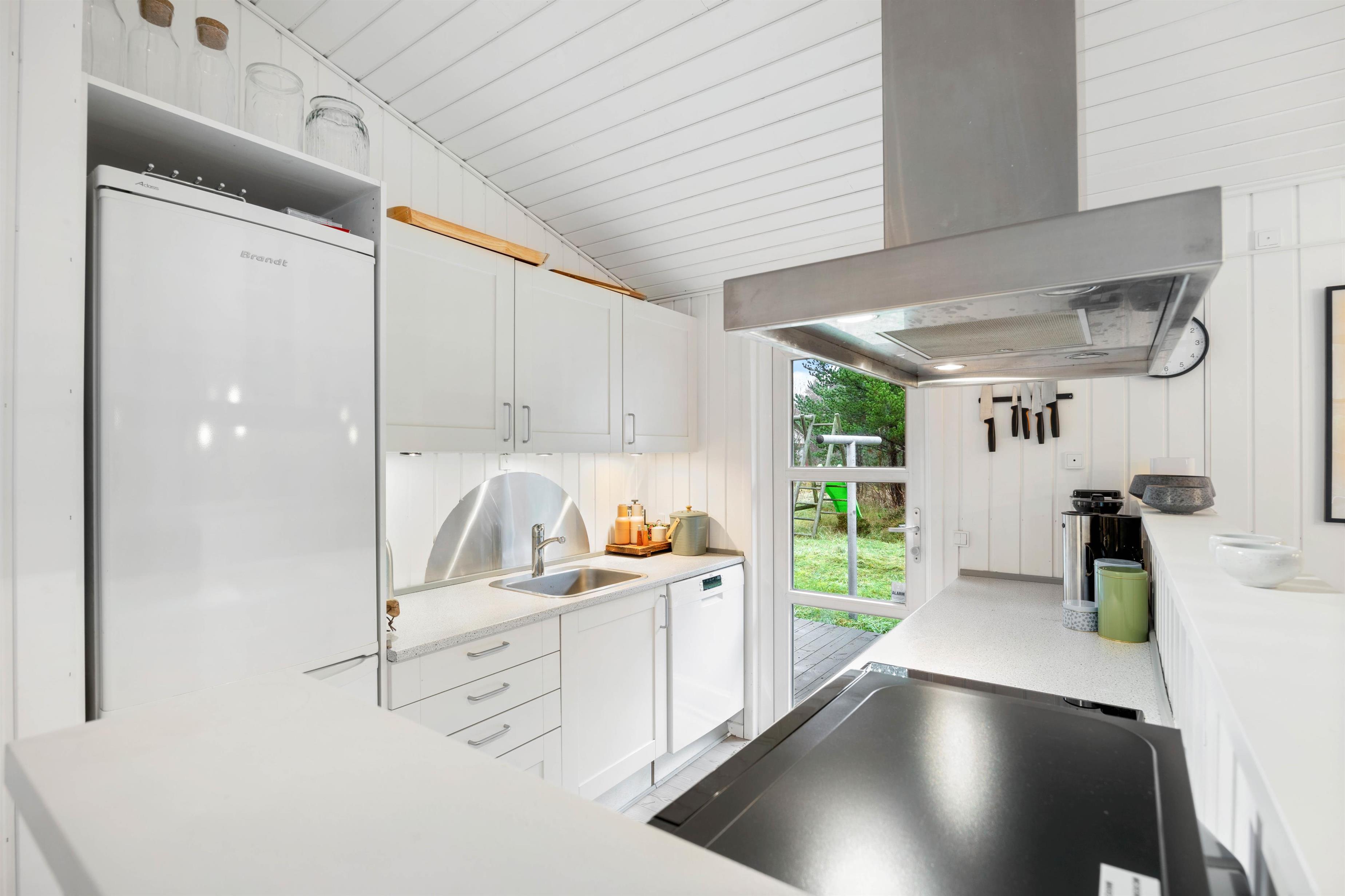 På Ejnar Mikkelsensvej 20 føler I jer hjemme straks, I træder ind ad døren. I bydes velkommen af en lys, luftig og dejlig feriestemning via de lyse trælaminatgulve, hvidmalede træbeklædte vægge og lofter op i kip. I stuen kan I slappe af i sofaen ved varmen fra ilden i brændeovnen, imens I nyder udsigten over naturgrunden og det fine lysindfald fra det brede vindues- og dørparti ud imod terrassen. Det åbne køkken i forbindelse med stuen indeholder alt, hvad I behøver for at forkæle hinanden med lækre hjemmelavede måltider.