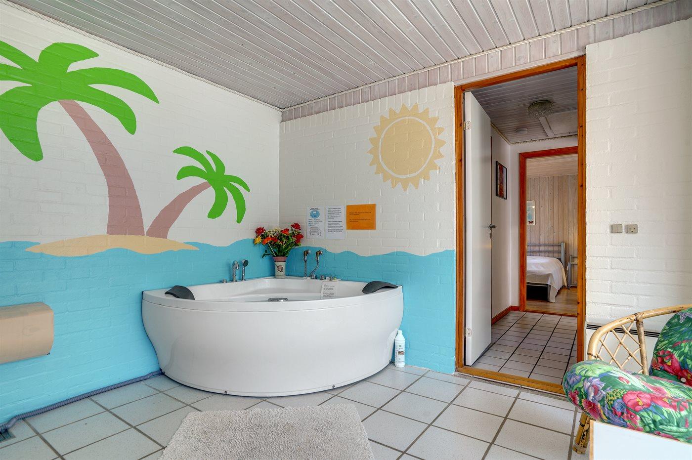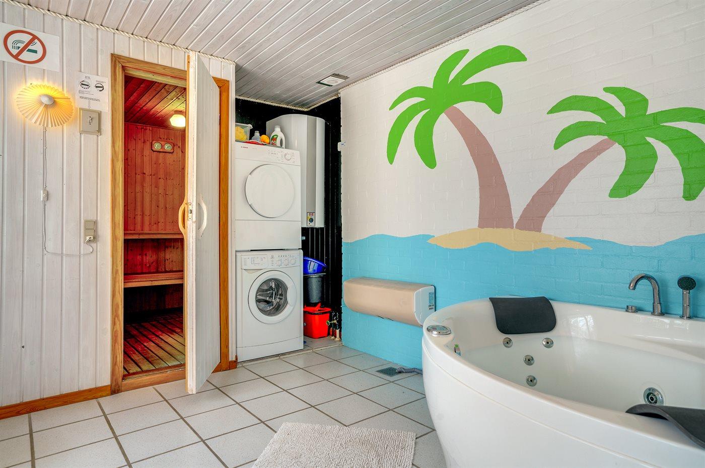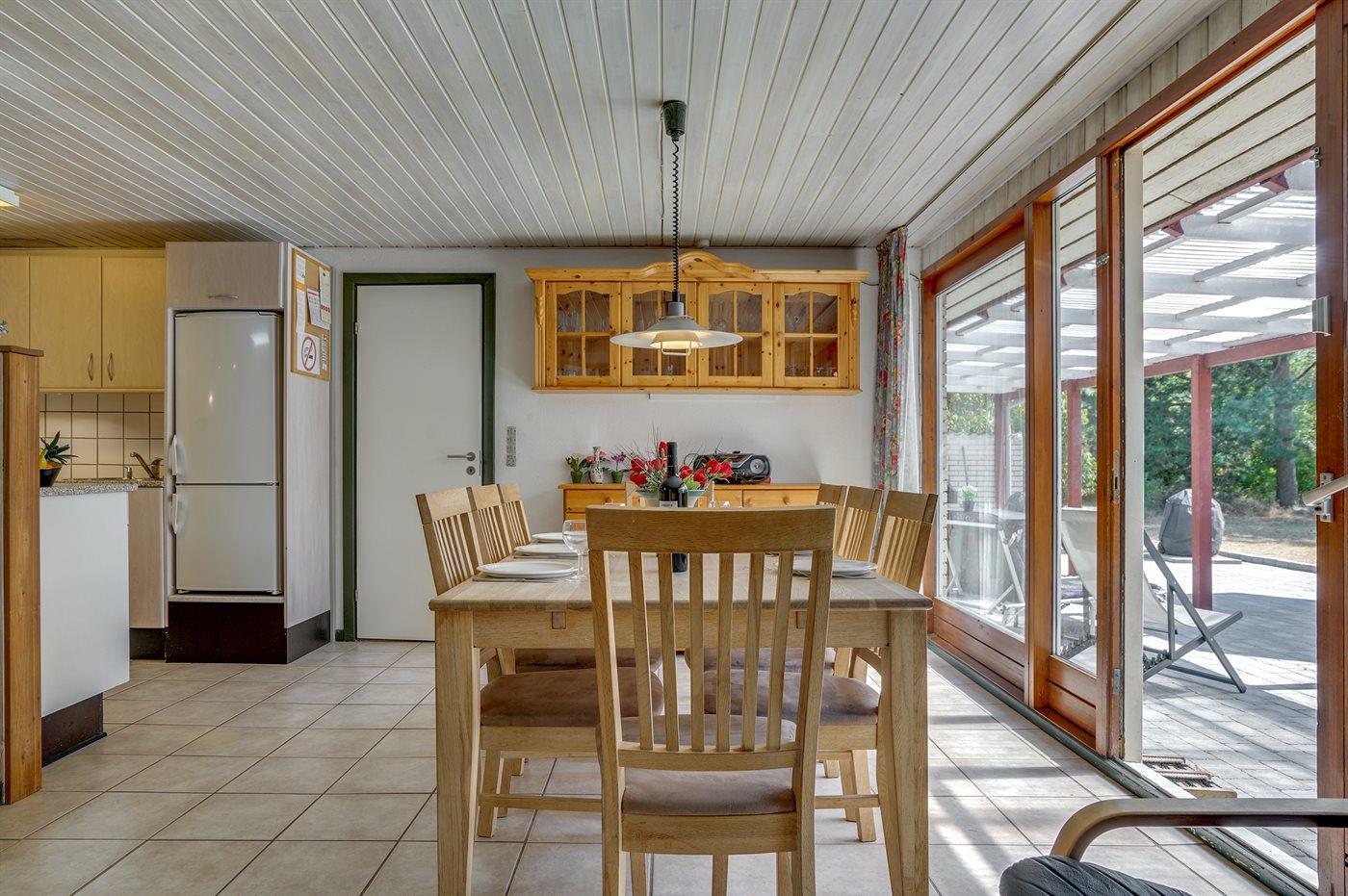 Skønt sommerhus i sten. Huset er beliggende på en naturgrund for enden af en blind vej - kun 400 m fra havet. Til huset hører såvel åben som overdækket terrasse med havemøbler. Huset er indrettet med dejlig stor opholdsstue med nyt klinkegulv og træbeklædte vægge og lofter. Sovepladserne fordeler sig på 4 soveværelser og er derfor velegnet som feriemål for 2 familier. Stuen er udstyret med brændeovn, TV med parabol (digital), DVD-afspiller, video, stereoanlæg med CD-afspiller og Wifi internet (computer skal medbringes). Køkkenet er indrettet med bl.a. fryser, mikrobølgeovn og opvaskemaskine. 2 badeværelser med klinkegulv og bruseniche. Dejlig spa-afdeling, der foruden 2-personers spa også indeholder en stor sauna. Der kan fra spa-afdelingen åbnes dør ud til terrassen. Huset opvarmes dels med brændeovn, dels med varmepumpe og dels med elradiatorer. Vaskemaskine og tørretumbler, høj barnestol og barneseng står også til rådighed for husets gæster. Der forefindes legeplads ganske tæt ved huset. Et godt sommerhus året rundt.