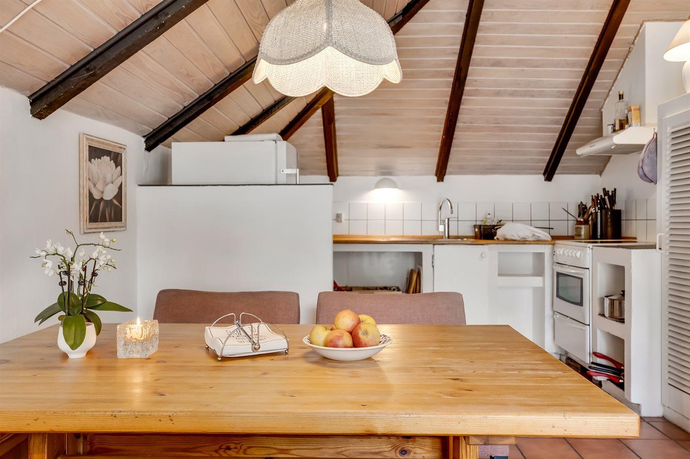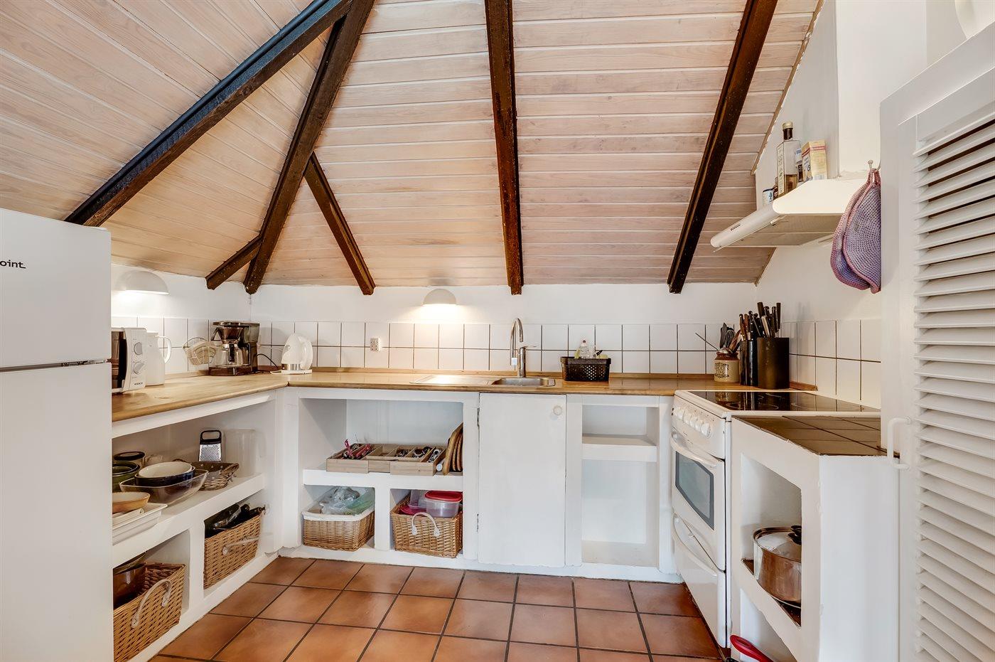 Køkkenet er udstyret med 1 køleskab. Der er 4 keramiske kogeplader, varmluftovn, mikrobølgeovn.