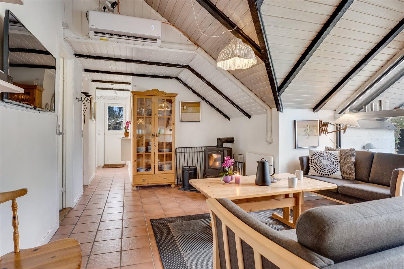 Hyggeligt sommerhus tæt på vandet med terrasse, brændeovn og elbiloplader i roligt område.