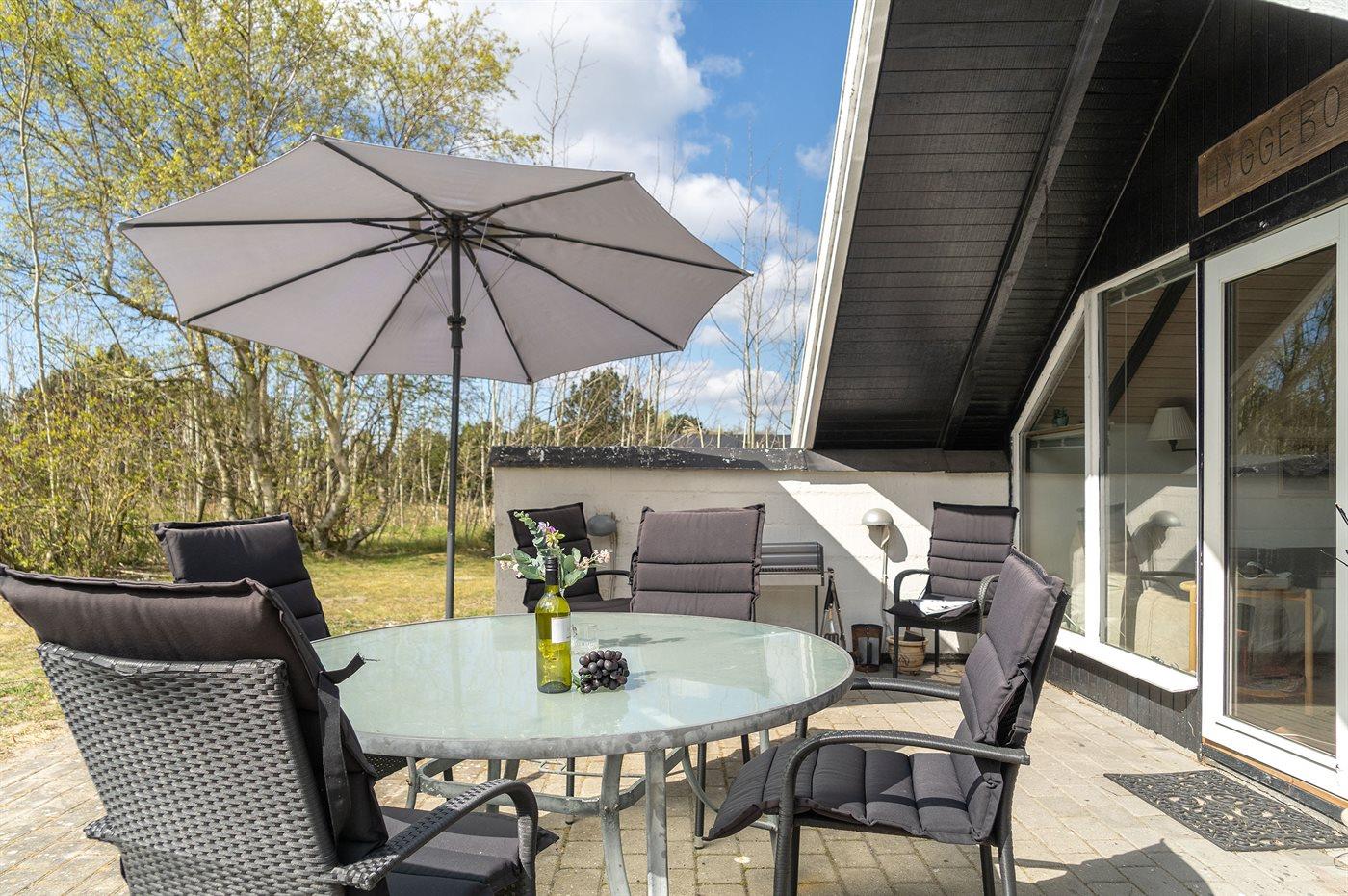 Ferieboligen er beliggende på en 796 m² stor naturgrund. Grunden er indhegnet. Der er 160 m til havet. Nærmeste forretning er beliggende i en afstand af 500 m. Til ferieboligen hører 40 m² terrasseareal. Gynge. Sandkasse. Rutchebane. Der er carport til rådighed. Der er installeret stik til opladning af elbil. Type 2 stik. Med 11 kW ladeeffekt. Parkering ved ferieboligen.