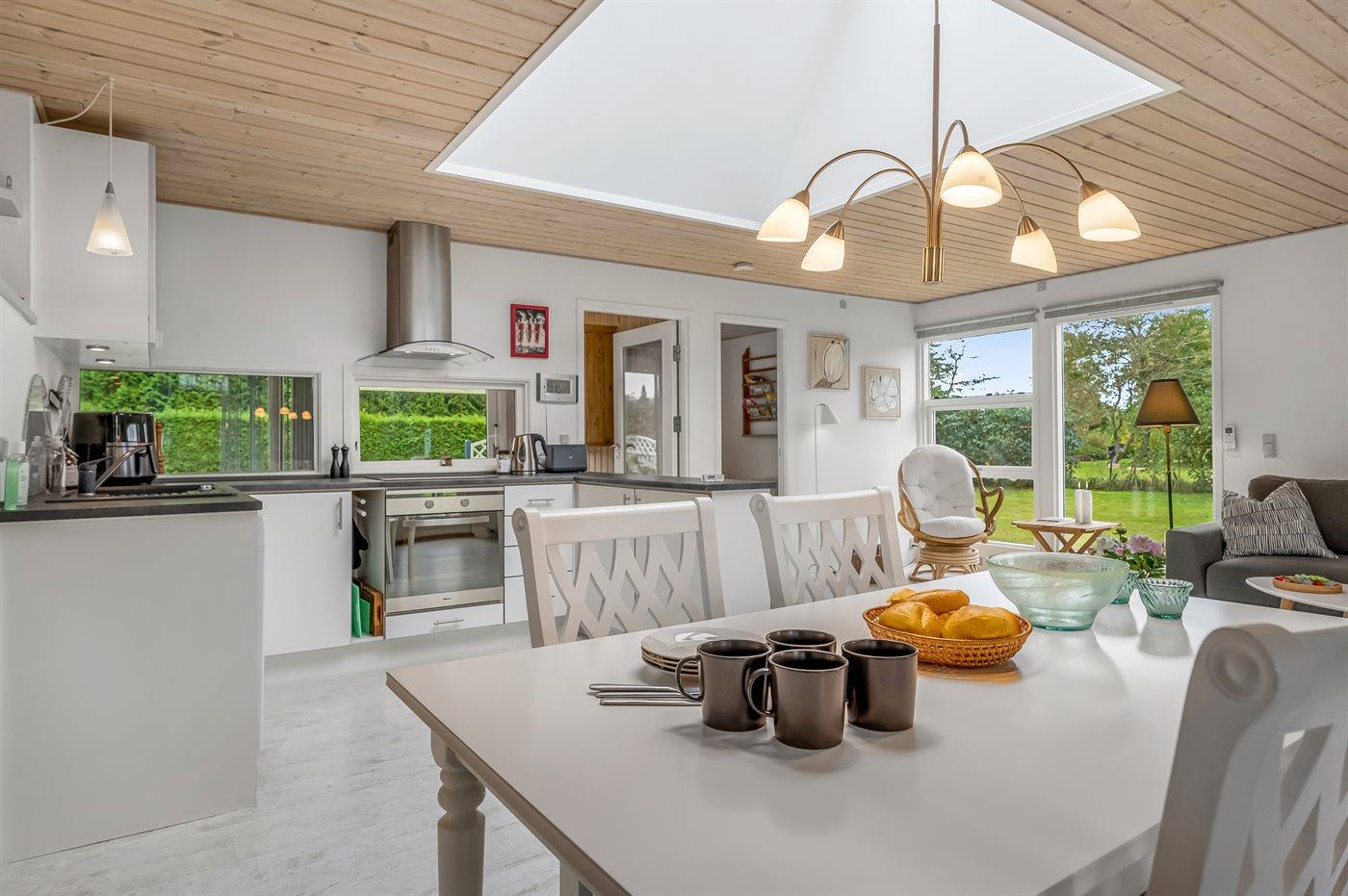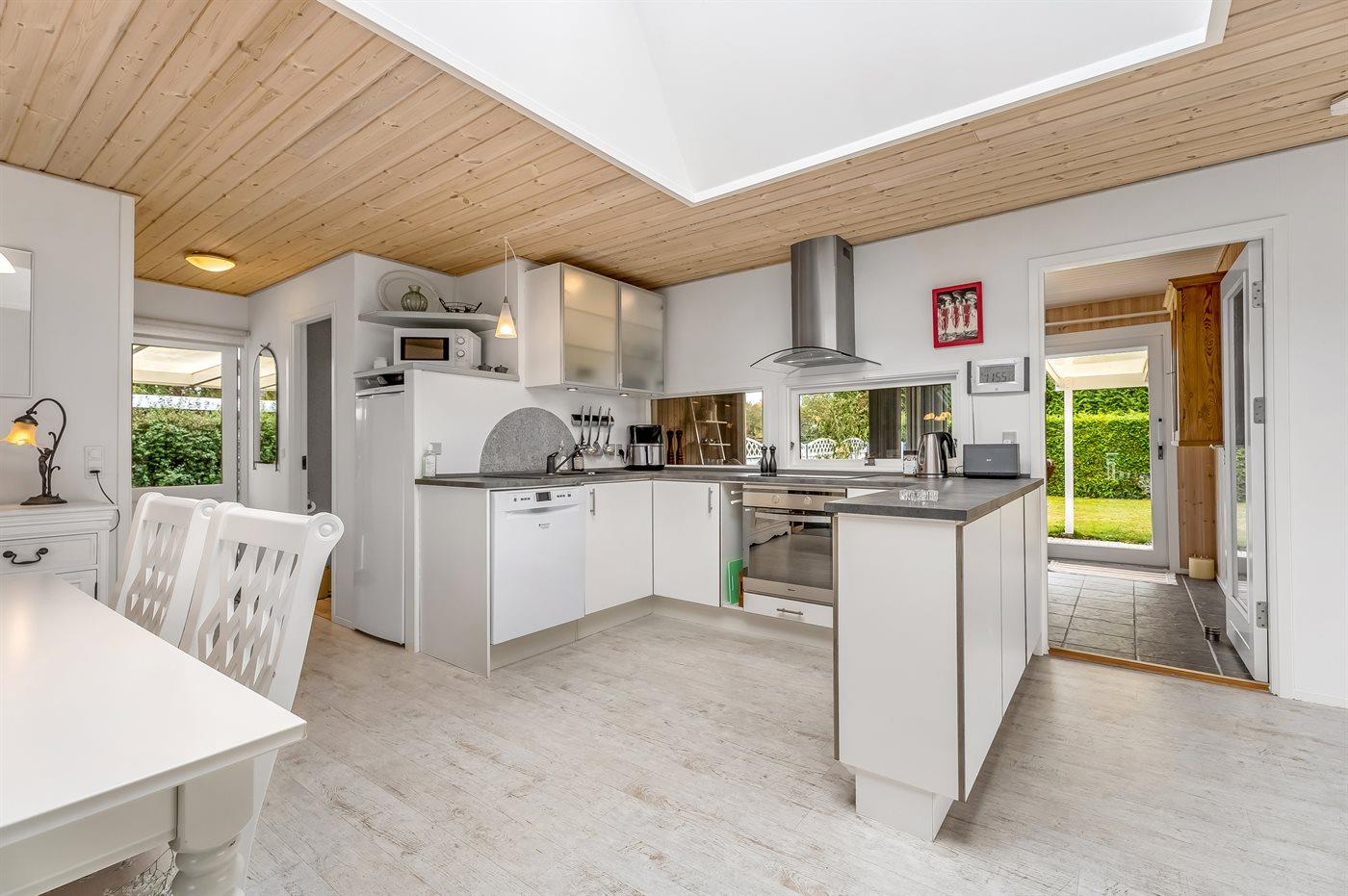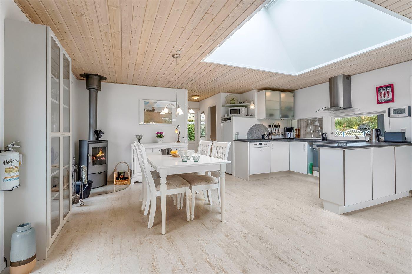 Køkkenet er udstyret med 1 køleskab. Der er 4 keramiske kogeplader, varmluftovn, mikrobølgeovn, Airfryer samt opvaskemaskine.