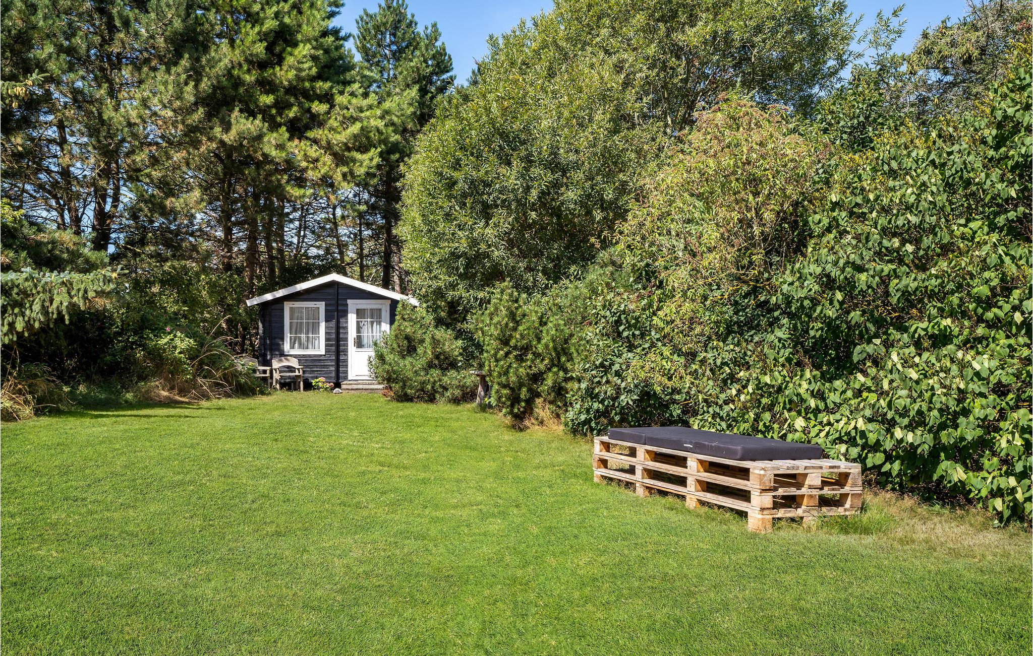 Fra stuen kommer man ud på den overdækkede terrasse med havemøbler og grill til afslappende eftermiddage og hyggelige sommeraftener. I haven er der masser af plads til sjov og leg, og der er også en udendørs bruser til de varme sommerdage eller til at skylle saltvandet af efter en dukkert.