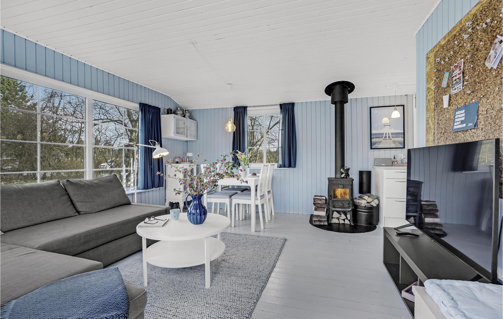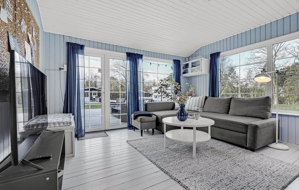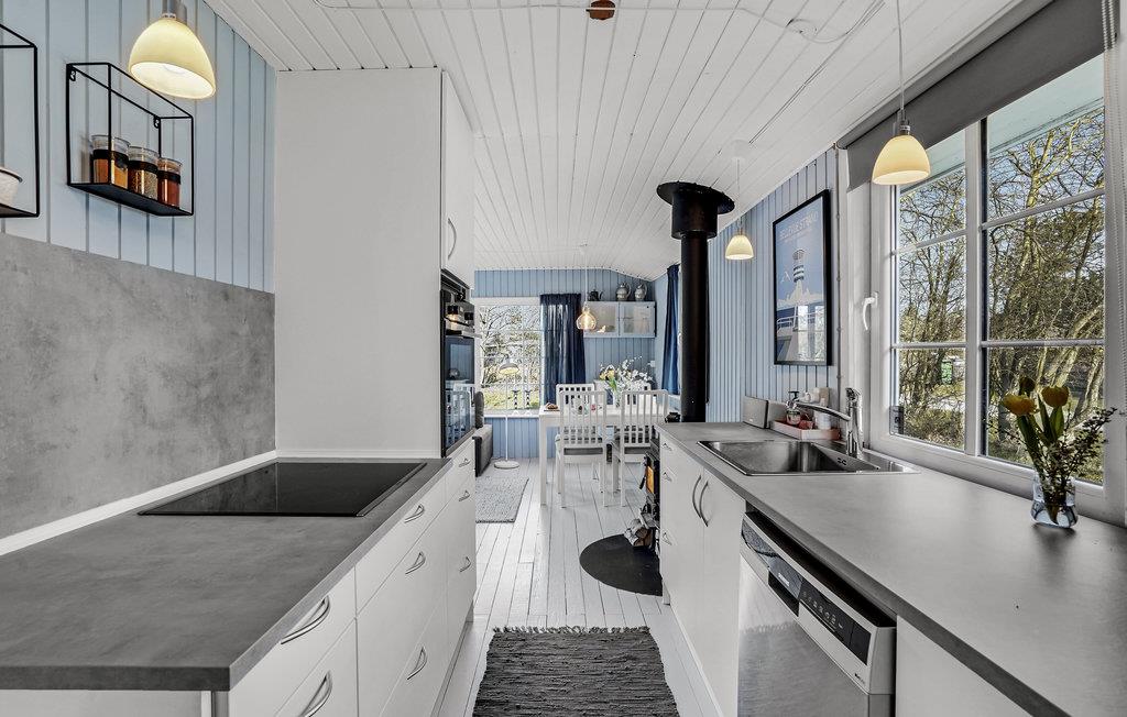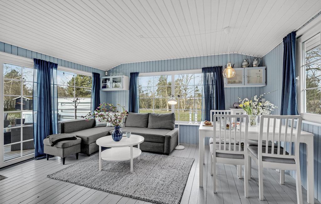 Velkommen til dette indbydende feriehus, som er smagfuldt indrettet i dejlige blå og hvide farver. Husets hjerte er den kombinerede opholds- og spisestue med spiseplads, brændeovn, skøn sofa og et stort fladskærms-TV, der indbyder til hyggelige filmaftener.