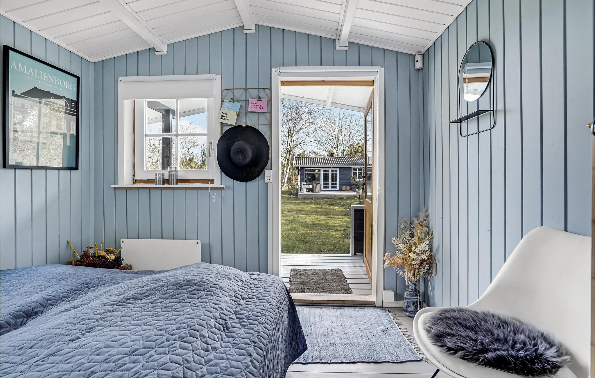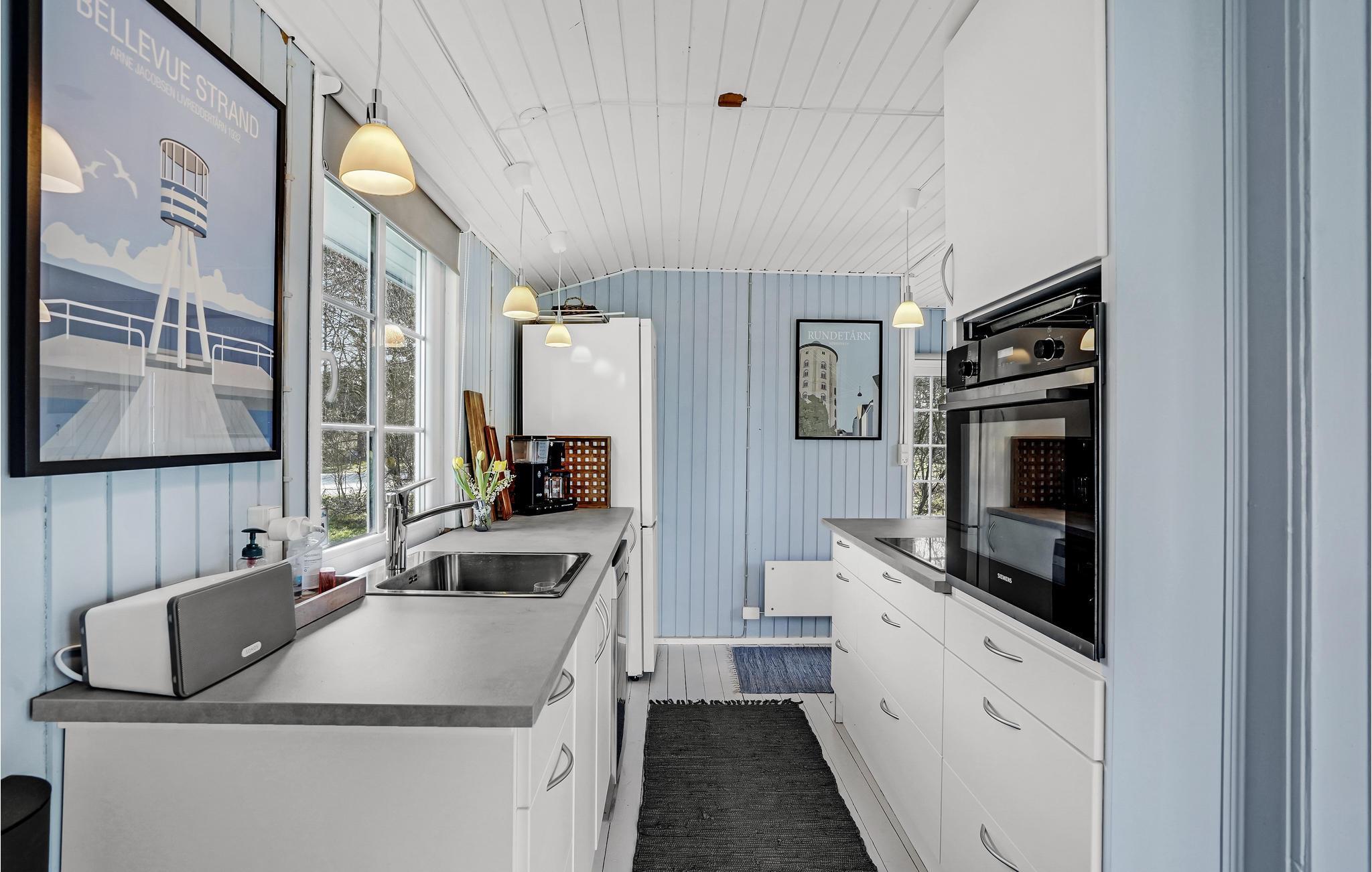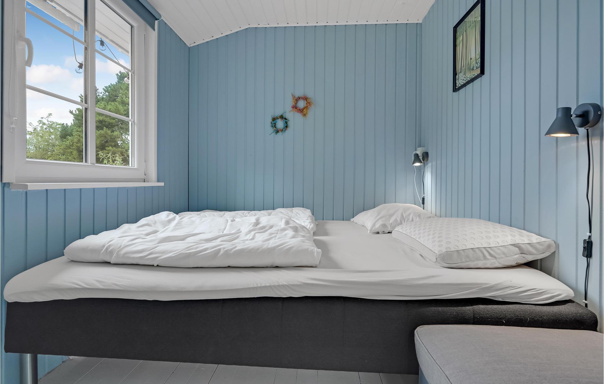 Velkommen til dette indbydende feriehus, som er smagfuldt indrettet i dejlige blå og hvide farver. Husets hjerte er den kombinerede opholds- og spisestue med spiseplads, brændeovn, skøn sofa og et stort fladskærms-TV, der indbyder til hyggelige filmaftener.