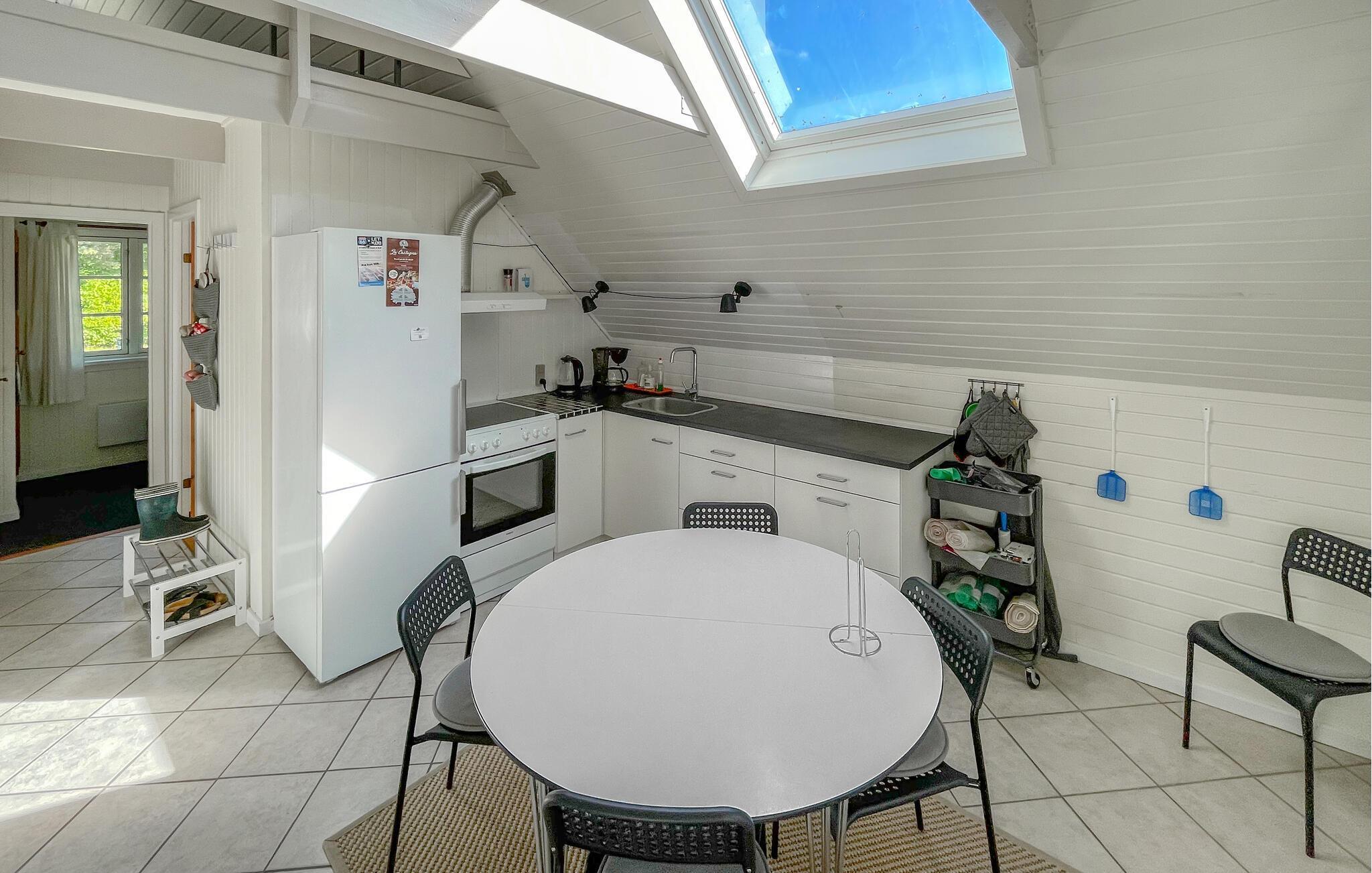 Find jer godt til rette i den lyse opholdsstue. Læn jer tilbage i de komfortable sofaer og udnyt det åbne design, der forbinder stue, køkken og spiseplads. Tilbered jeres måltider i det praktiske køkken og nyd dem under et stort ovenlysvindue, der lukker masser af naturligt lys ind. Oplev den lille hems, der er tilgængelig via en stige og brug pladsen som en lille oase.