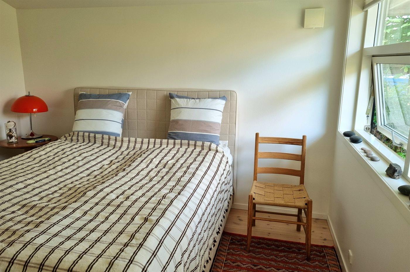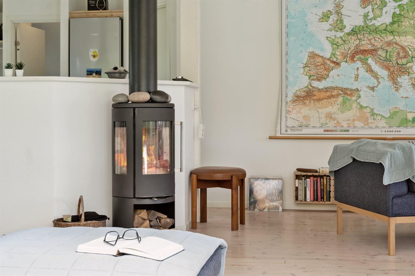 Stor og meget lyst, åbent køkken/alrum med store vinduer mod haven, 2 soveværelser, brændeovn, energirigtig varmepumpe og gulvvarme i bad.