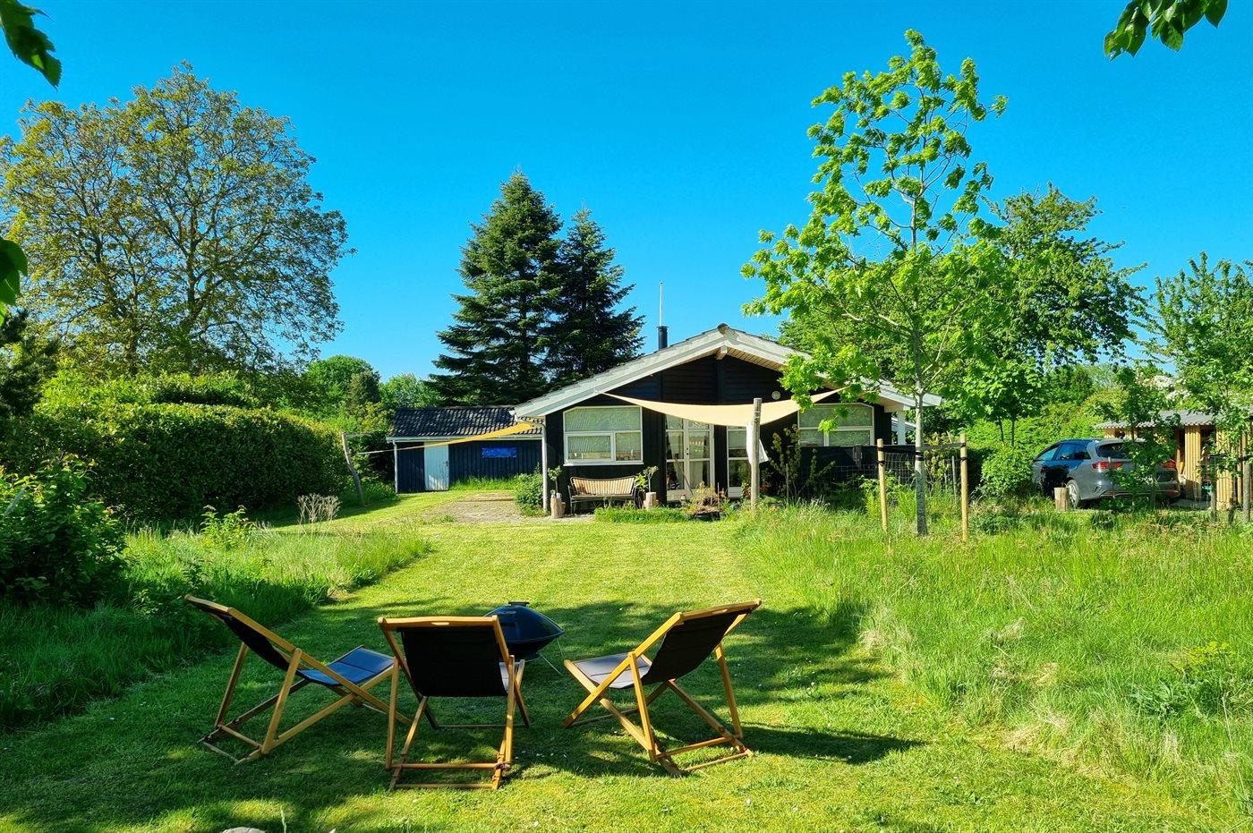 Sommerhus med god beliggenhed ved Lille Kregme med en vild naturhave med træer, solsejle, bålfad og hængekøje.