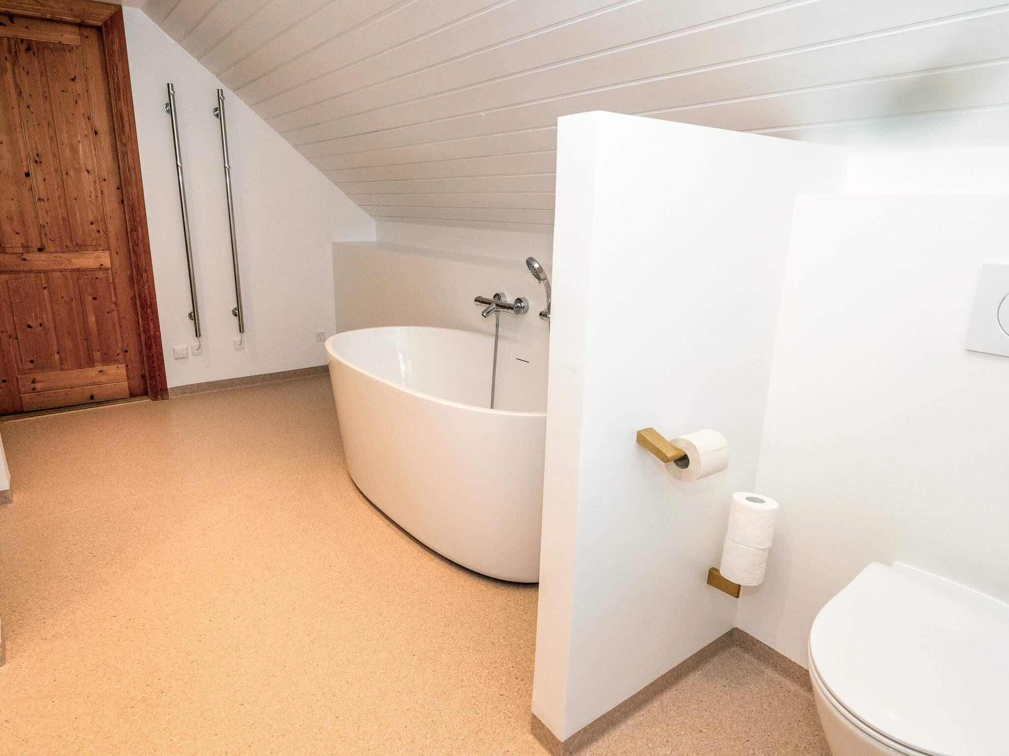 Højkvalitets badeværelse med badeplads, brusekabine og toilet.