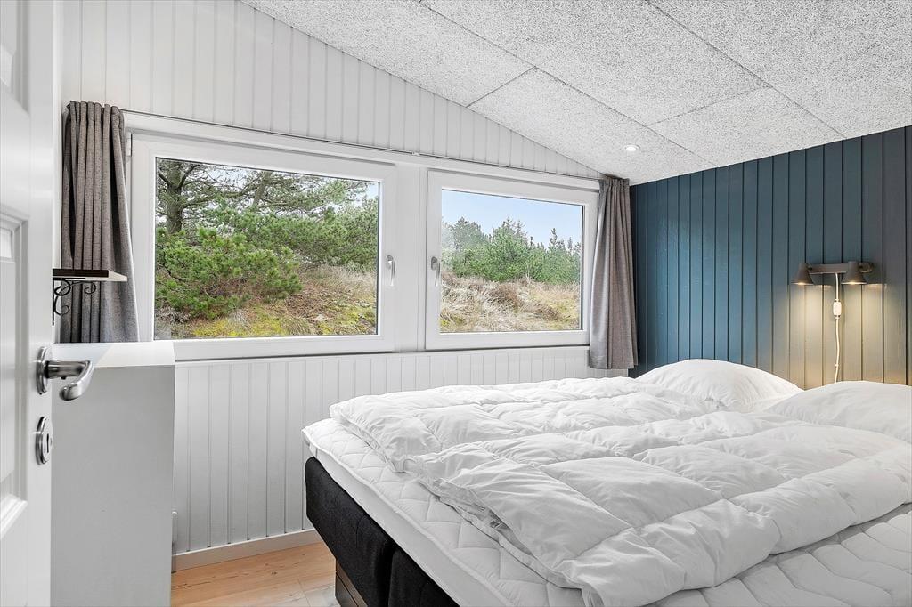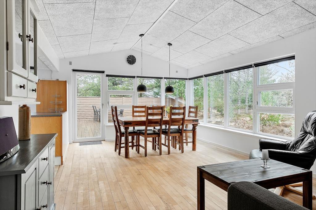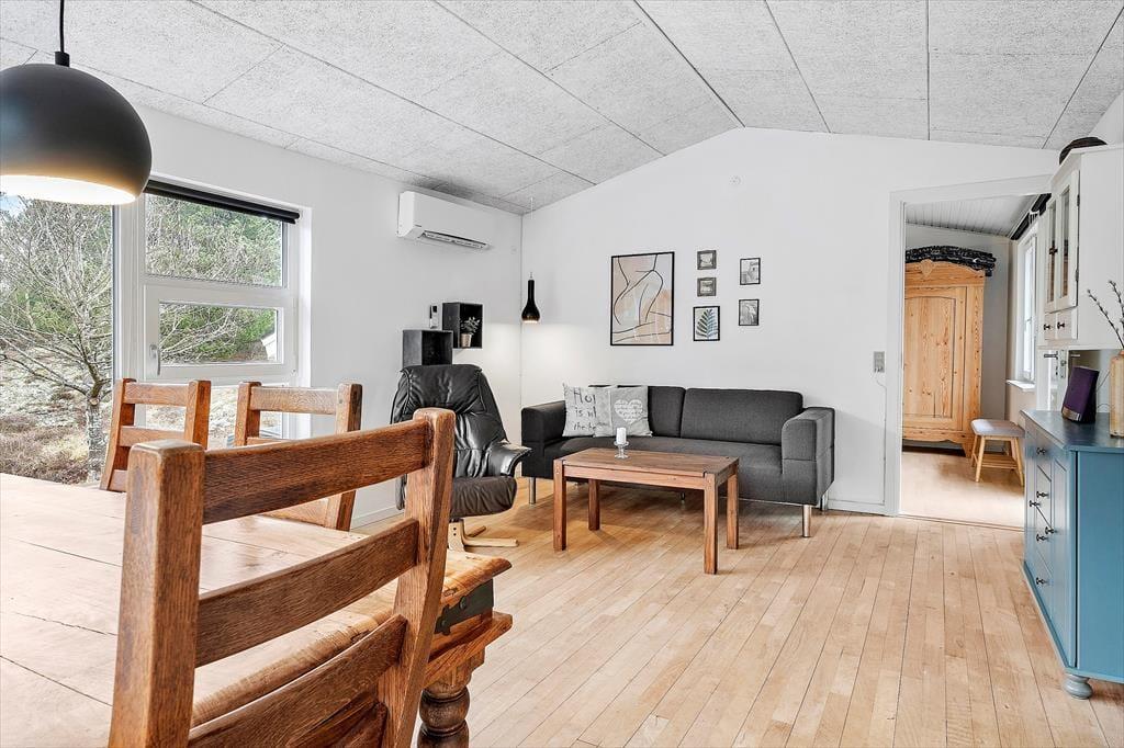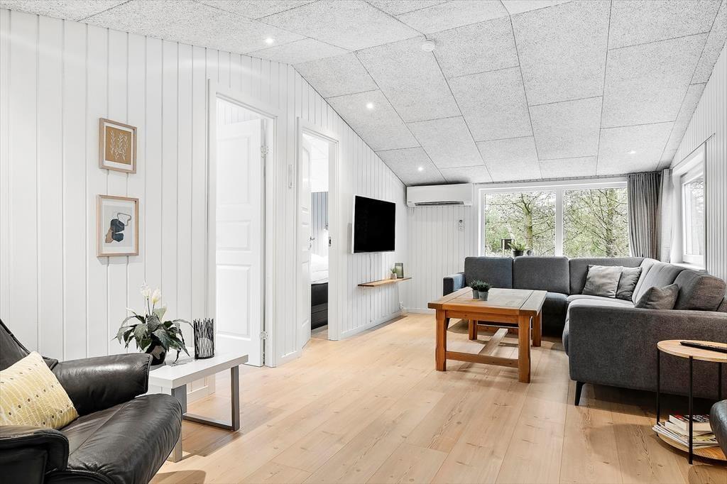 Atmosfæren er lys, let og indbydende inden døre, hvor du kan brede dig på hele 96 m². Der er tre soveværelser i huset, så der er sagtens plads til seks feriegæster. Alle tre soveværelser er udstyret med en dobbeltseng. Et badeværelse hører selvfølgelig også med til planløsningen, og som en skøn livsnyderdetalje er der installeret en sauna i sommerhuset. Derudover er en stor del af kvadratmeterne dedikeret til opholdsafdelingen: Her ligger køkken og to stuer i åben forbindelse, blot adskilt af et enkelt trin. Den ene stue er udstyret med bløde siddemøbler, fladskærms-tv og varmepumpe, mens den anden byder på spisebord og en komfortabel sofa.