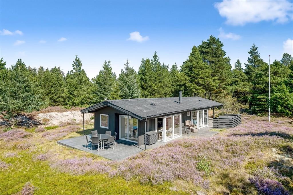 Selvom det er rart at opholde sig indenfor, er det nu også fristende at rykke ud i det fri, hvor det skønneste terrassemiljø breder sig rundt om sommerhuset: Her kan du sidde helt tæt på naturgrundens duftende lyng, hvor insekter arbejder ihærdigt på at samle nektar, mens du selv kan slappe helt af og nyde feriefreden. Fyrretræerne skærmer af ind mod de få naboer, der findes her for enden af M S Schouwsvej – og mon ikke det næsten er til at mærke på den friske luft og den tilbagelænede atmosfære, at der bare er få hundrede meter hen til Vadehavet?