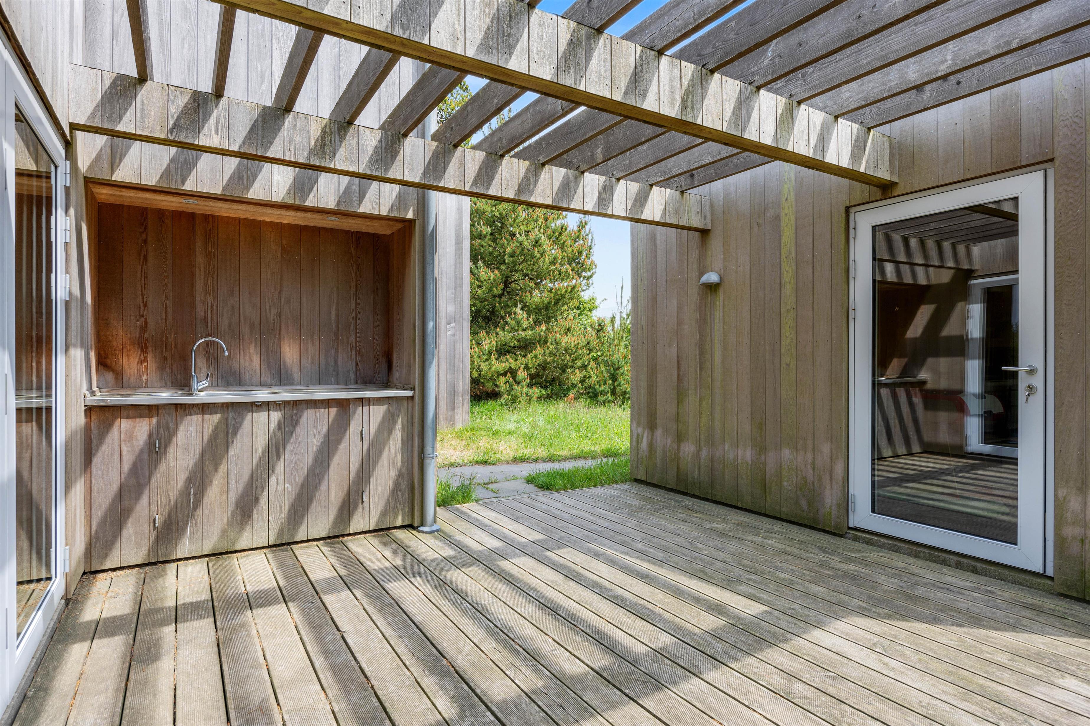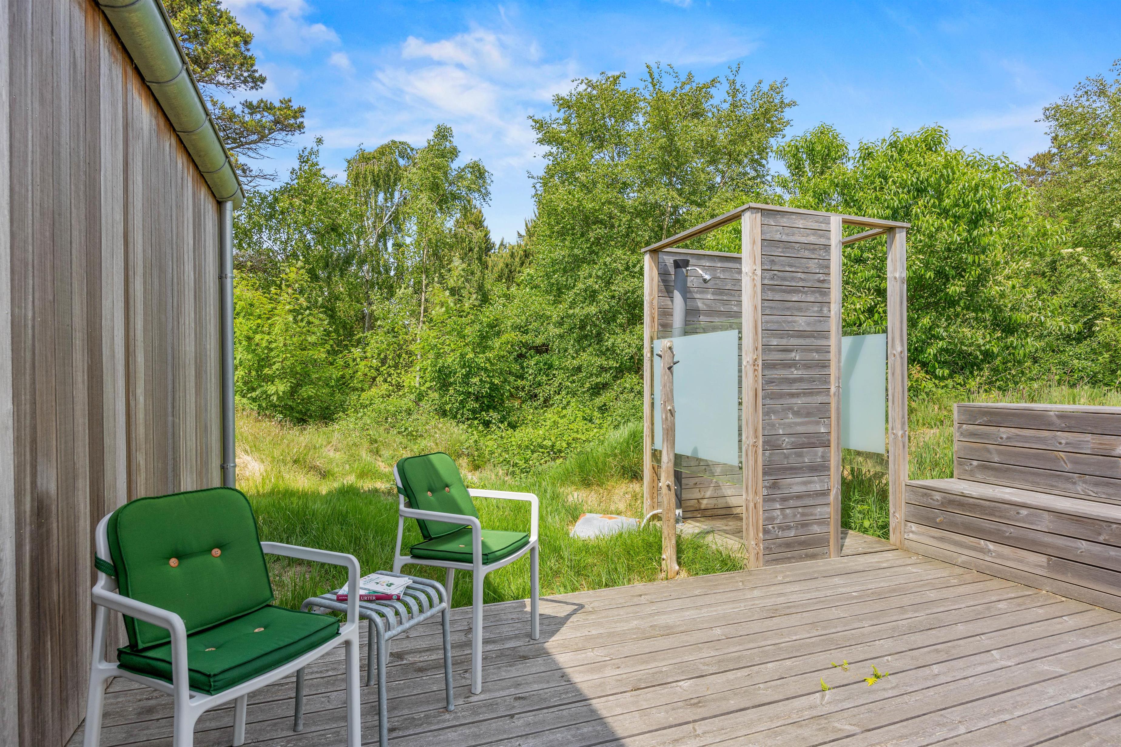 Ønsker I at lave maden udendørs, er her såmænd også et udekøkken til rådighed! Naturligvis er her også en grill, så flokkens grillmester har mulighed for at trylle! Praktisk finder I udenfor en solopvarmet udebruser, perfekt til at skylle sandet væk efter en tur i vandet, der findes 400 meter herfra. Udebruseren kan benyttes fra april til november.