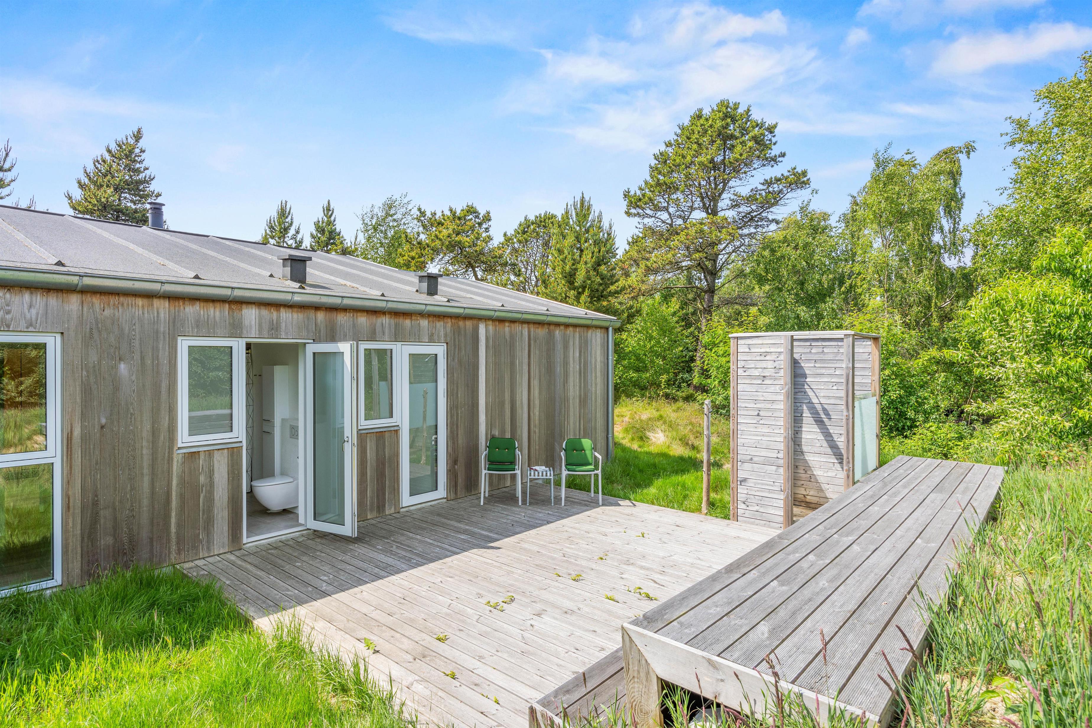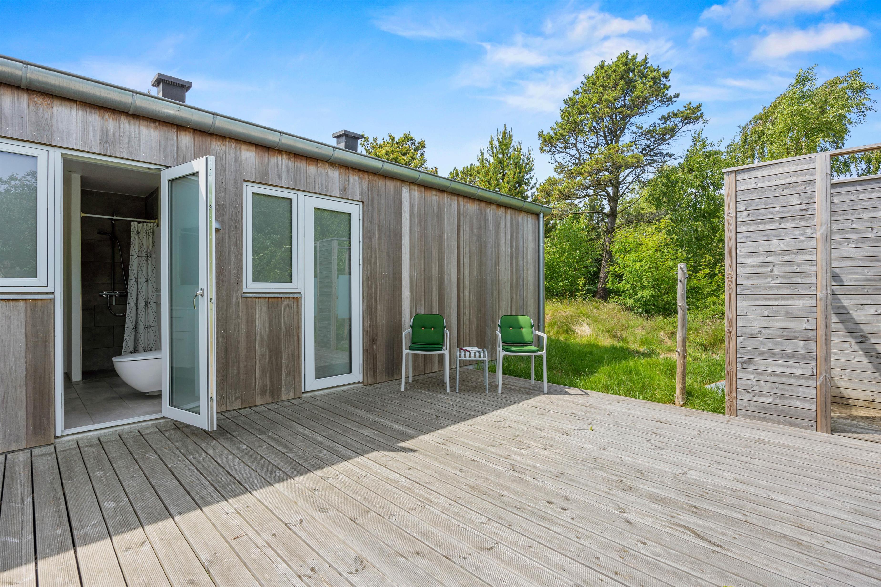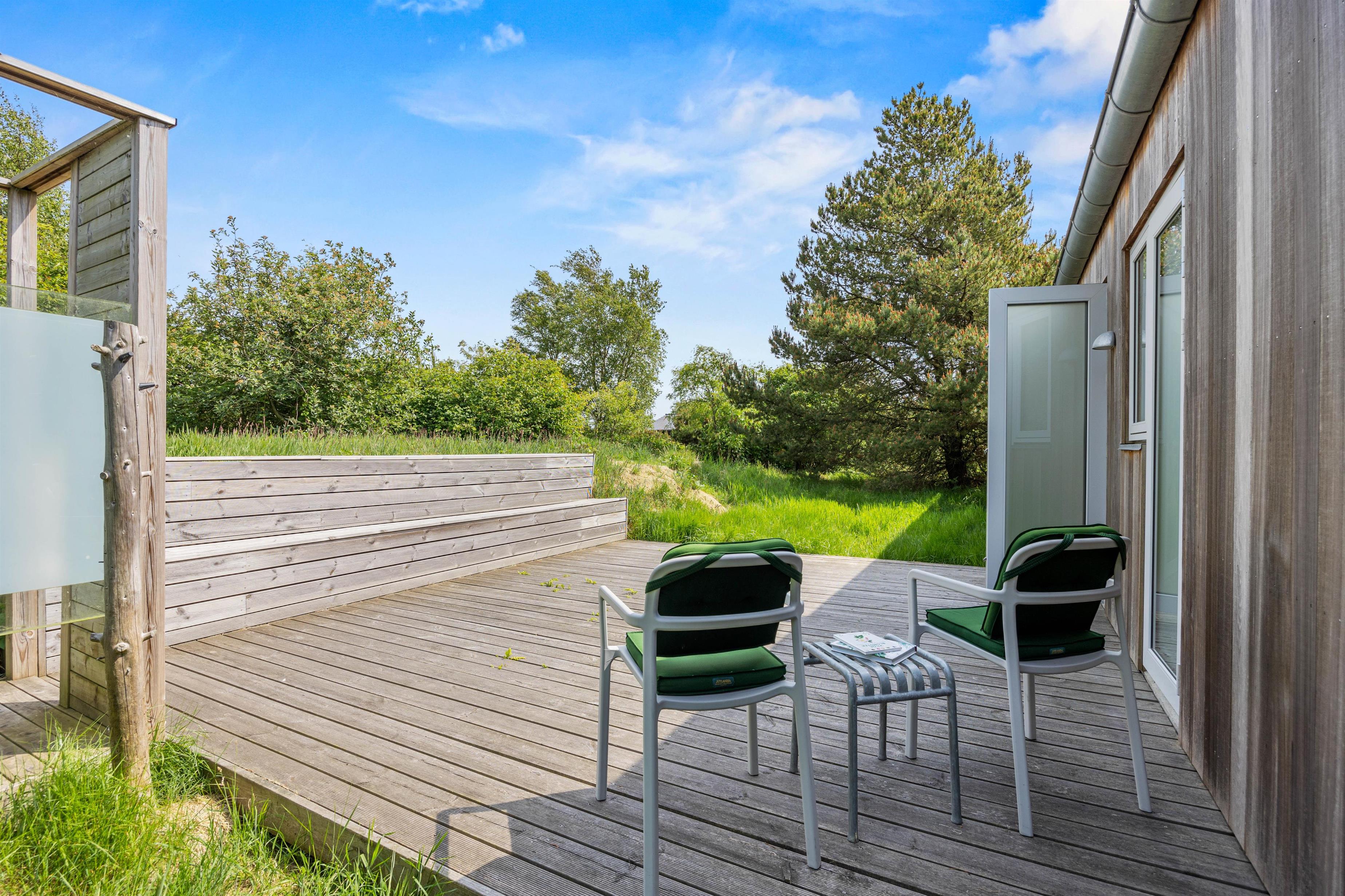 Rundt om sommerhuset er der anlagt fine terrasser, således I altid har mulighed for at fine en lækrog og nyde solen. Havemøblerne venter allerede på jer! Efter en dag lang på farten, kan I afslutte dagen med en hyggelig middag under åben himmel. I har en dejlig morgenterrasse med skøn udsigt over de lyngklædte klitter.