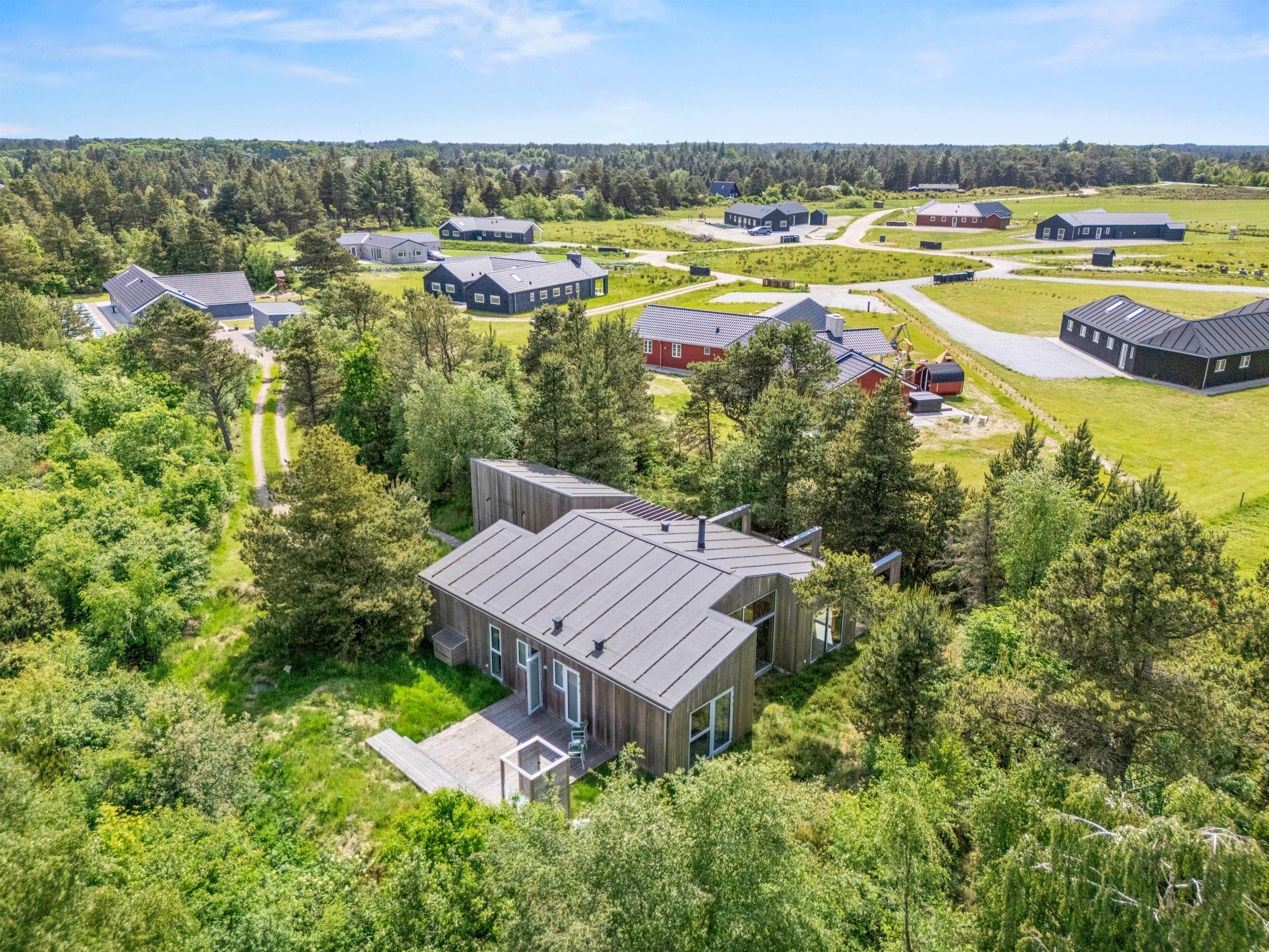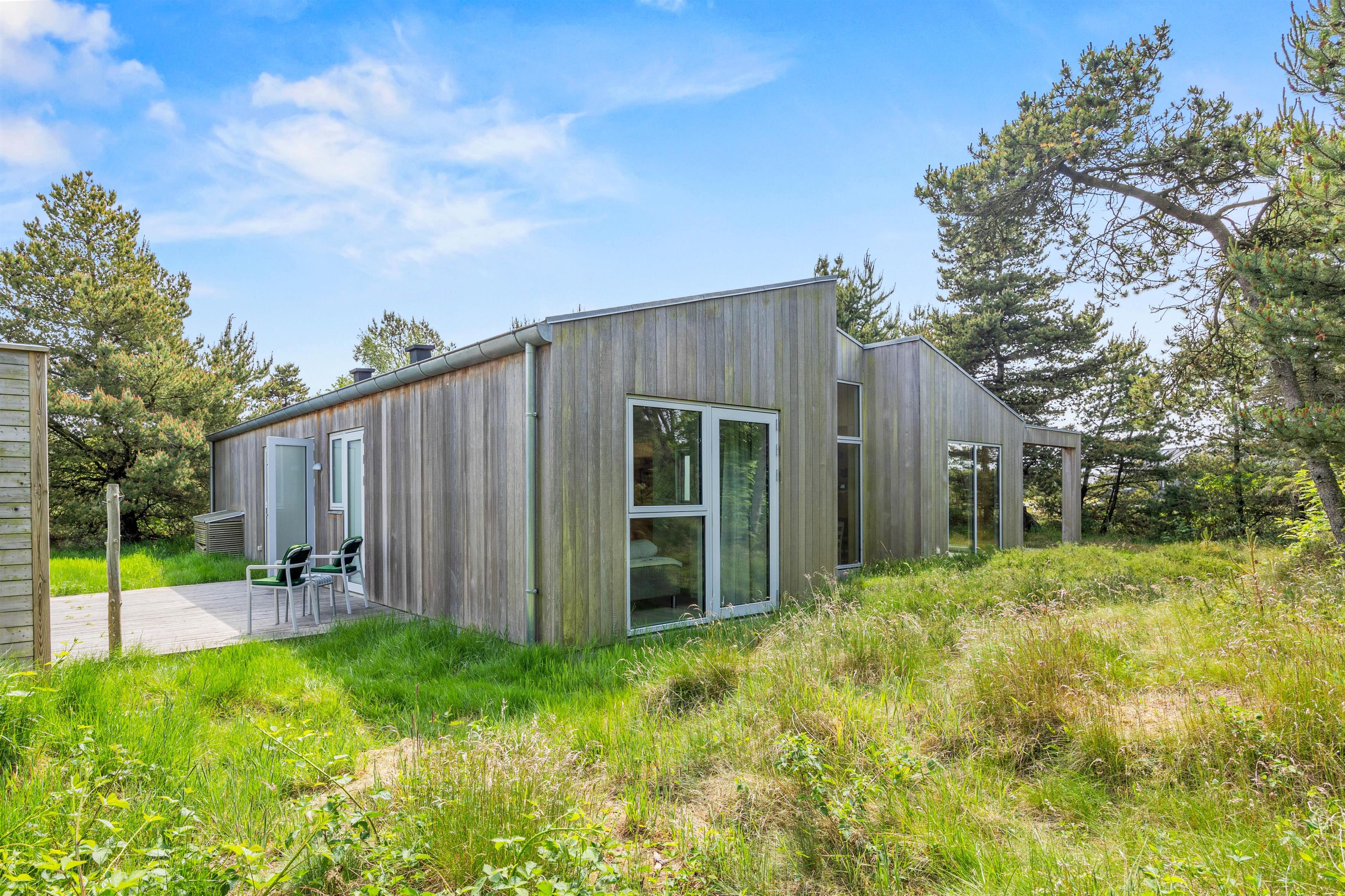 Huset er beliggende på en skøn ugenert grund, lyngklædt med fyrretræer. Hele grunden er omgivet af træer og lyngklædte klitter.