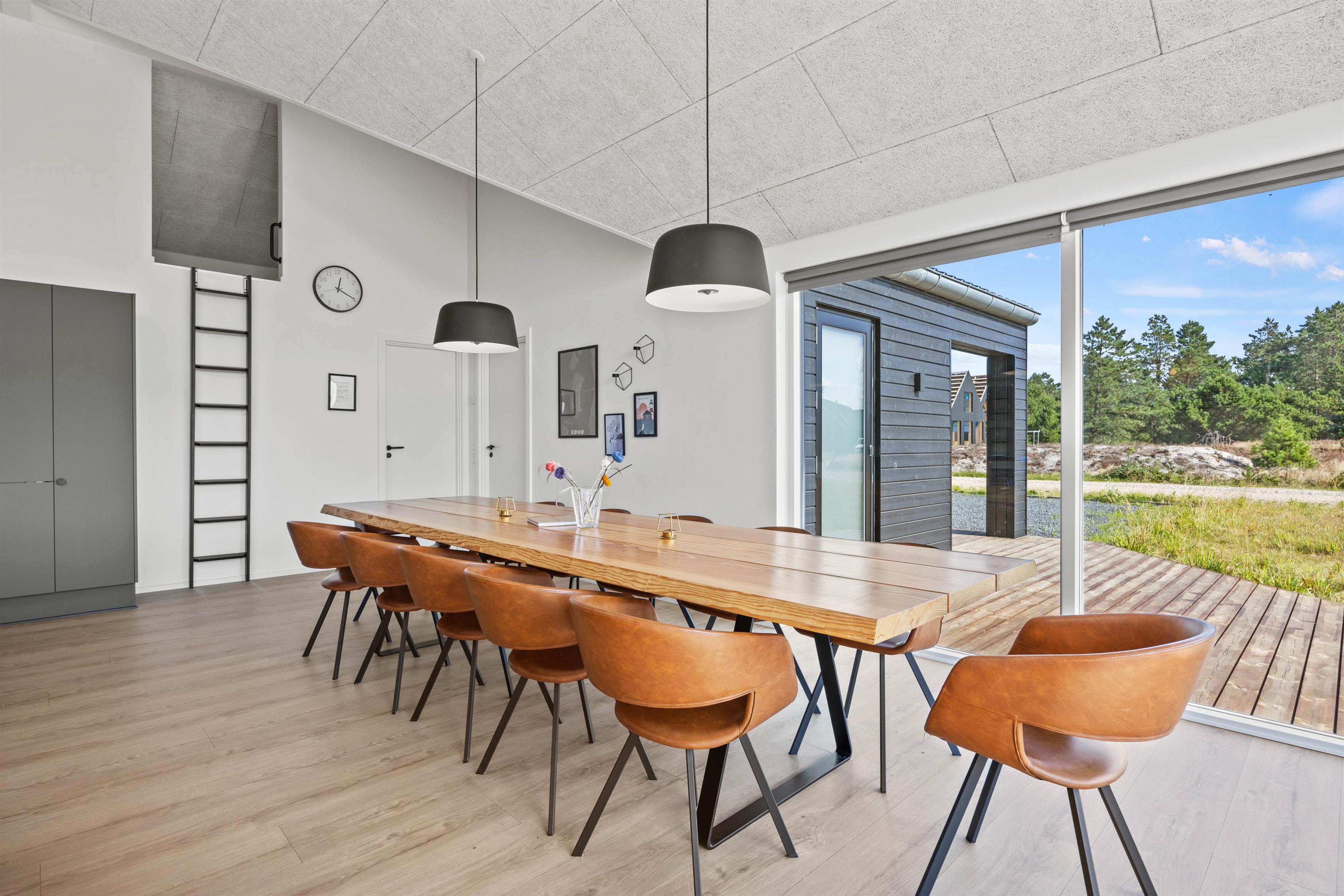 Hjertet i sommerhuset er det store køkkenalrum, hvor de rene linjer fra det veludstyrede køkken med opvaskemaskine står i skarp kontrast til det rå udtryk fra spisepladsen og opholdsstuen. Her har I det perfekte samlingssted for hele familien med gode muligheder for samvær.