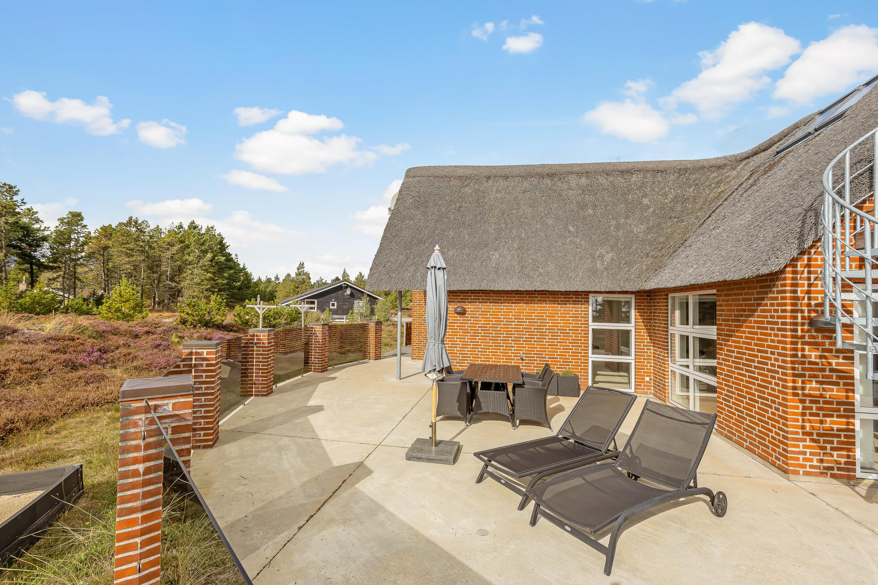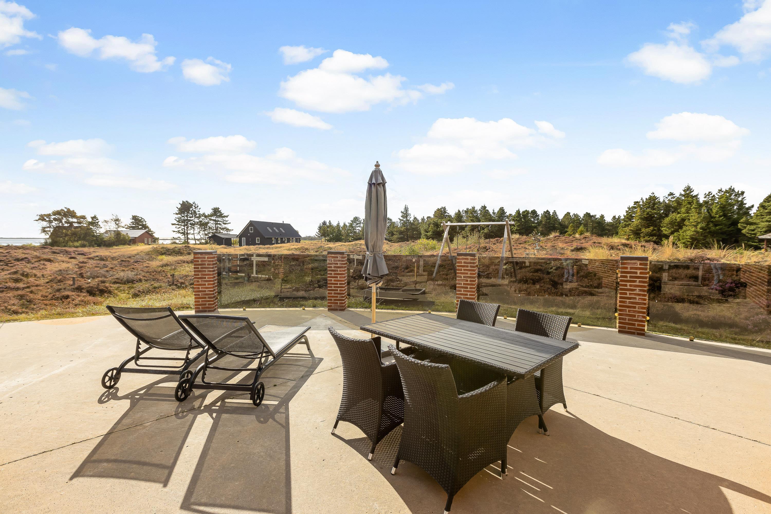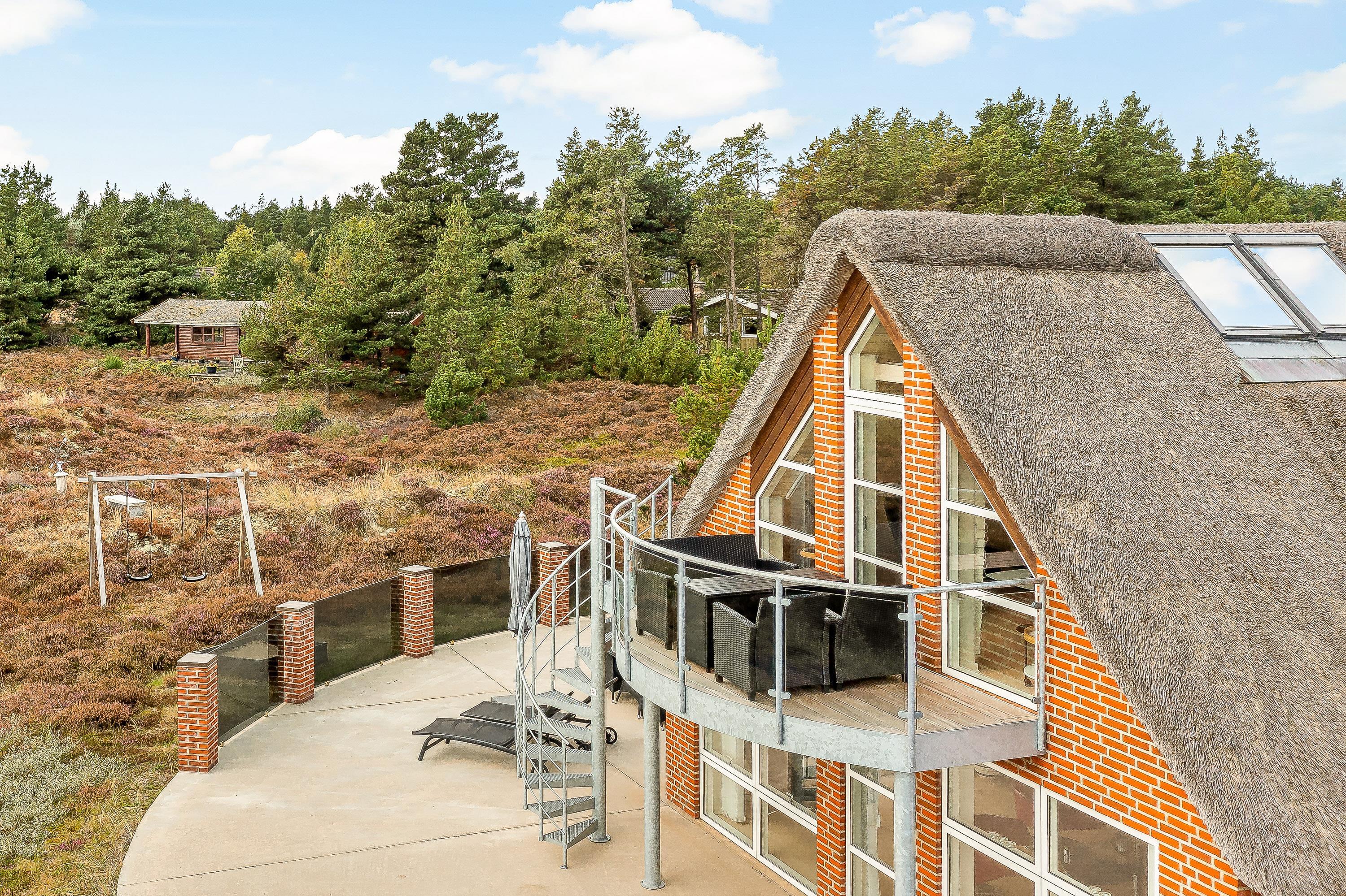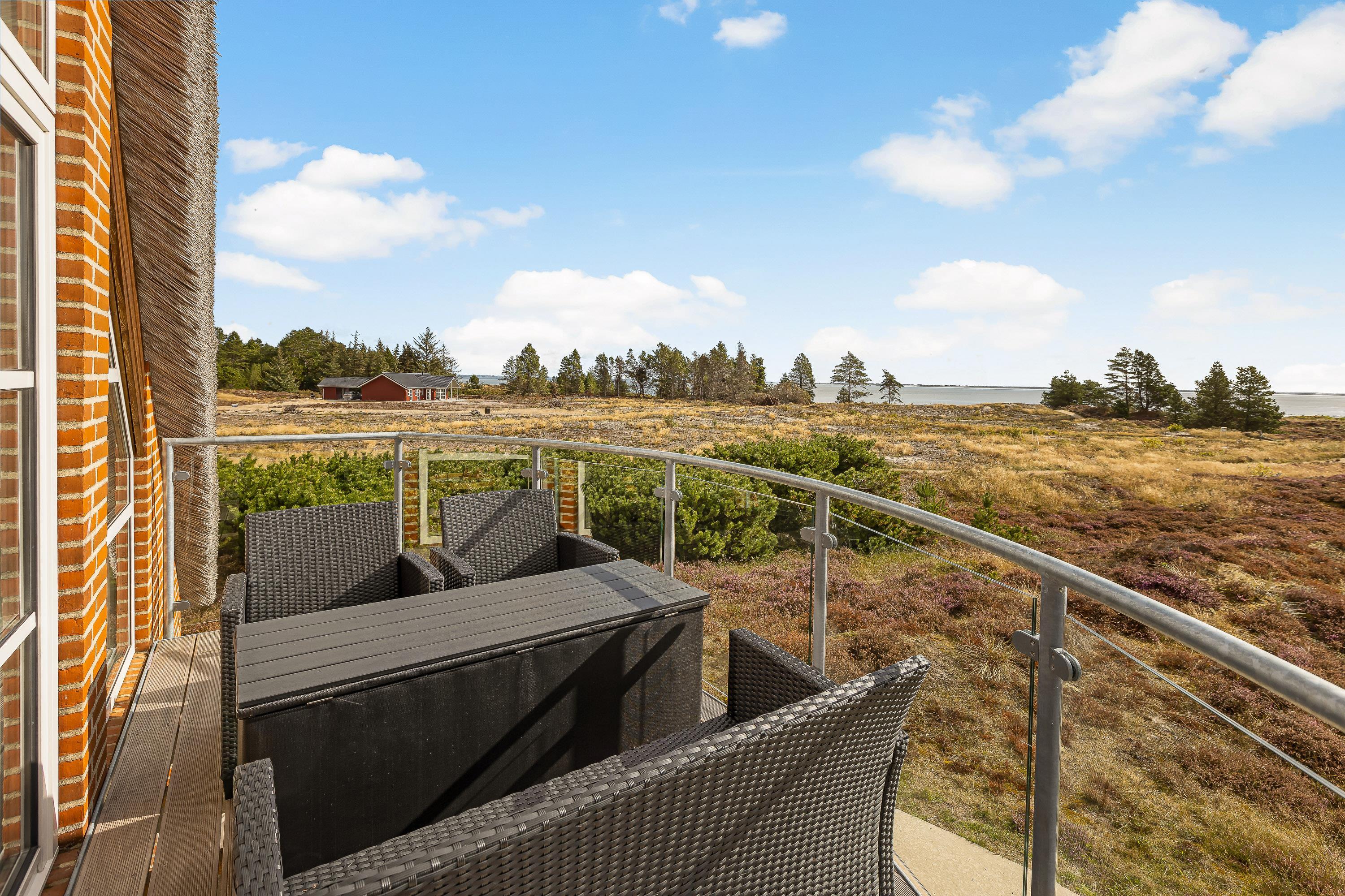 Som et highlight har dette feriehus en hems, hvorfra I har adgang til altanen.Fra terrasse har I den flotteste udsigt over grundens hede og lyng til Vadehavet. Den 2500m² store naturgrund byder på en stor terrasse, hvor I kan tilbringe mange timer sammen. Spis morgenmaden, læs en bog på solvognen og nyd en friskbrygget kop kaffe, mens børnene leger på gynge og i sandkassen.