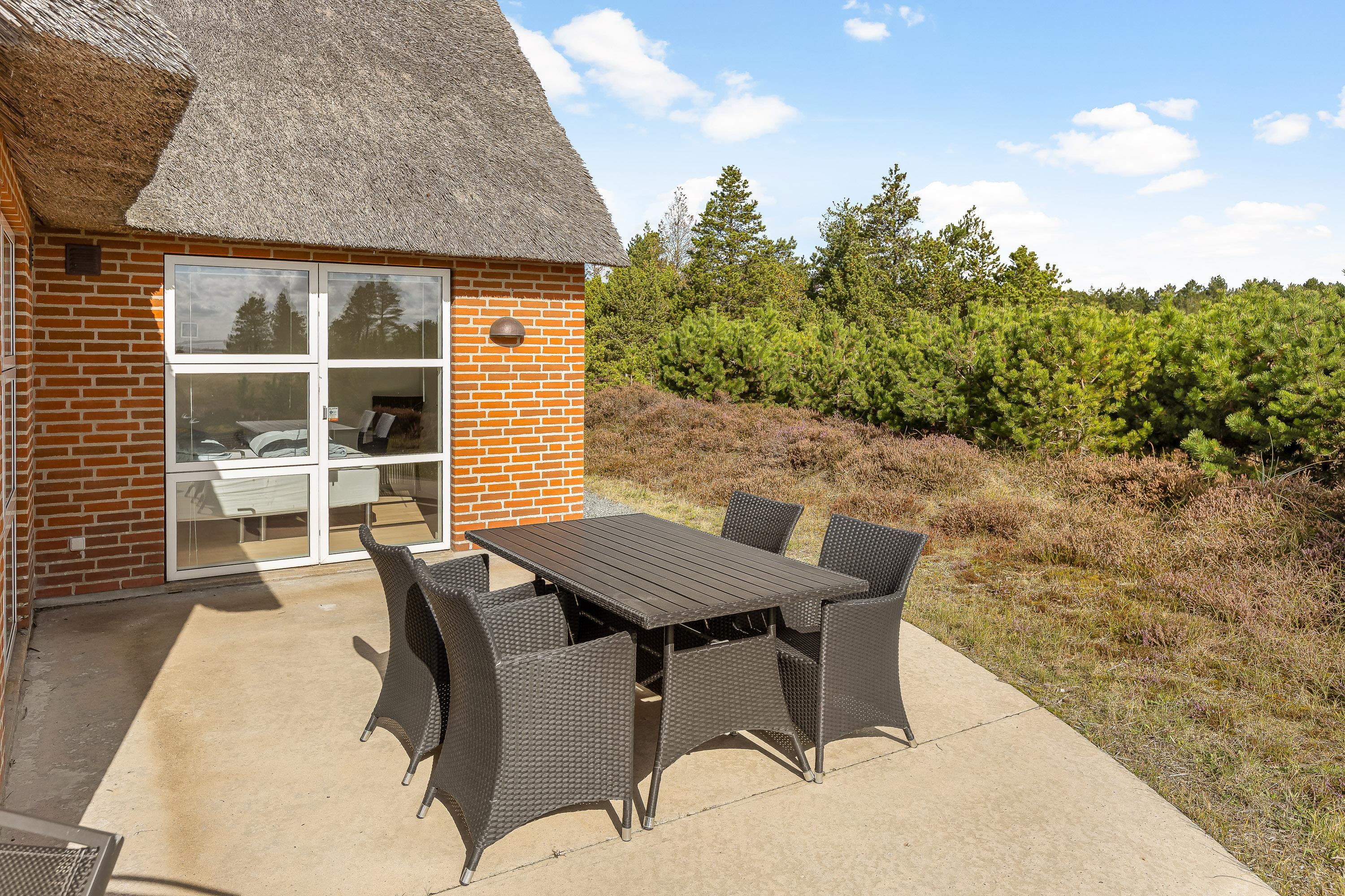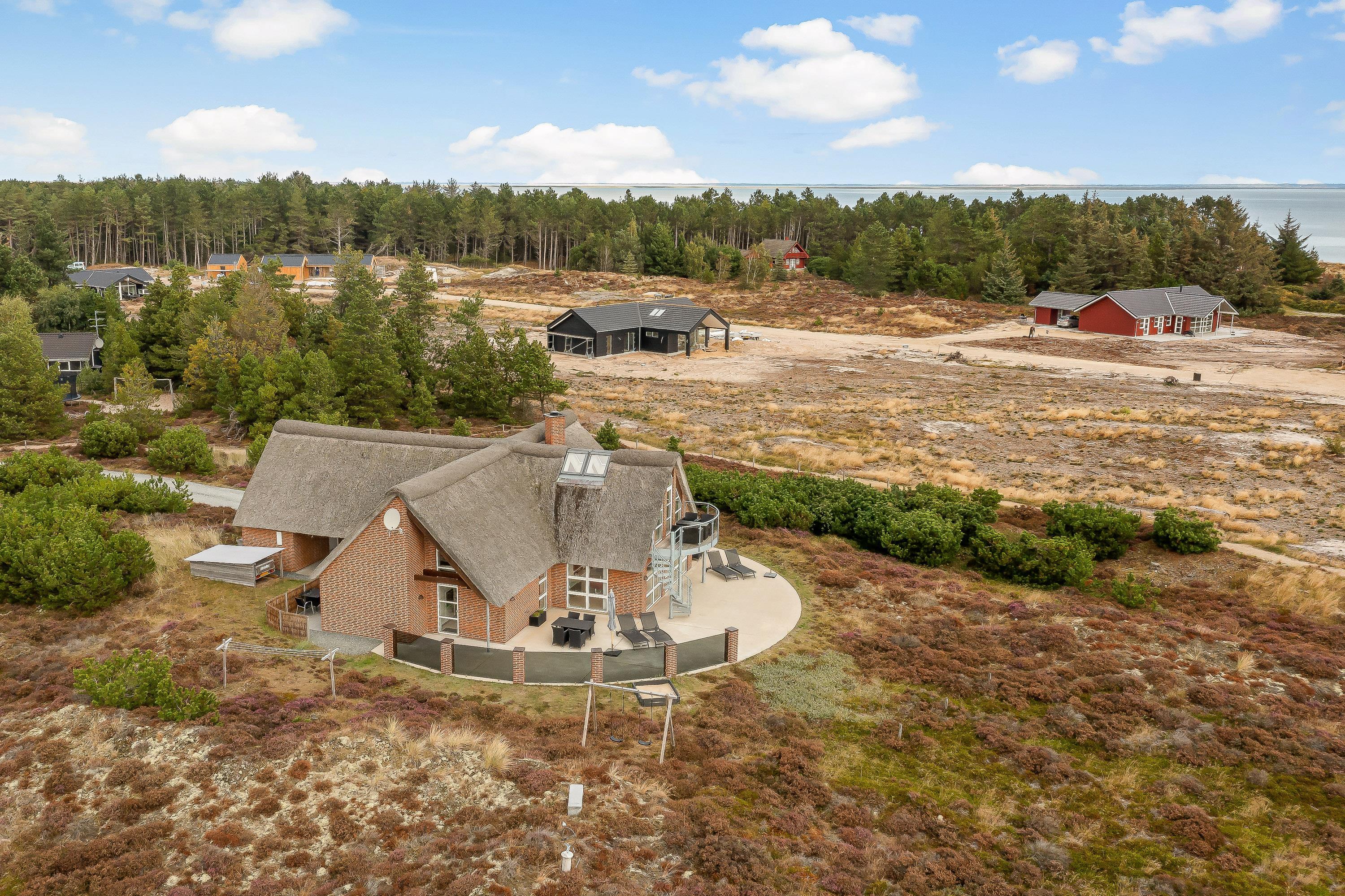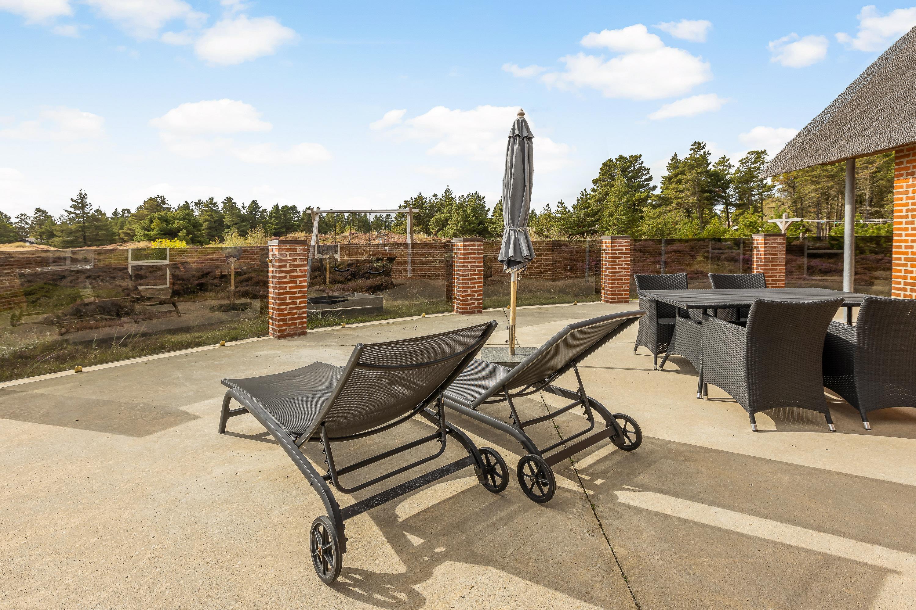 Som et highlight har dette feriehus en hems, hvorfra I har adgang til altanen.Fra terrasse har I den flotteste udsigt over grundens hede og lyng til Vadehavet. Den 2500m² store naturgrund byder på en stor terrasse, hvor I kan tilbringe mange timer sammen. Spis morgenmaden, læs en bog på solvognen og nyd en friskbrygget kop kaffe, mens børnene leger på gynge og i sandkassen.