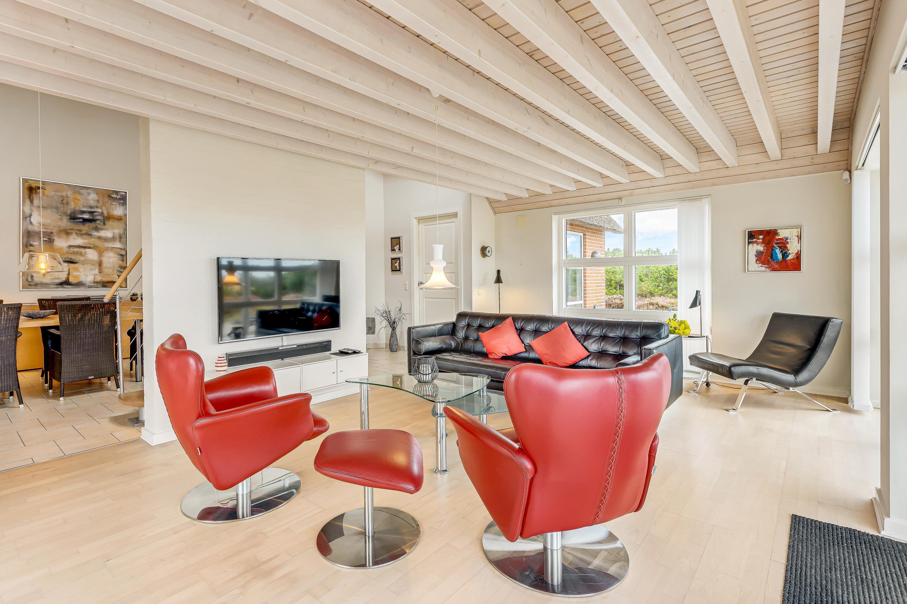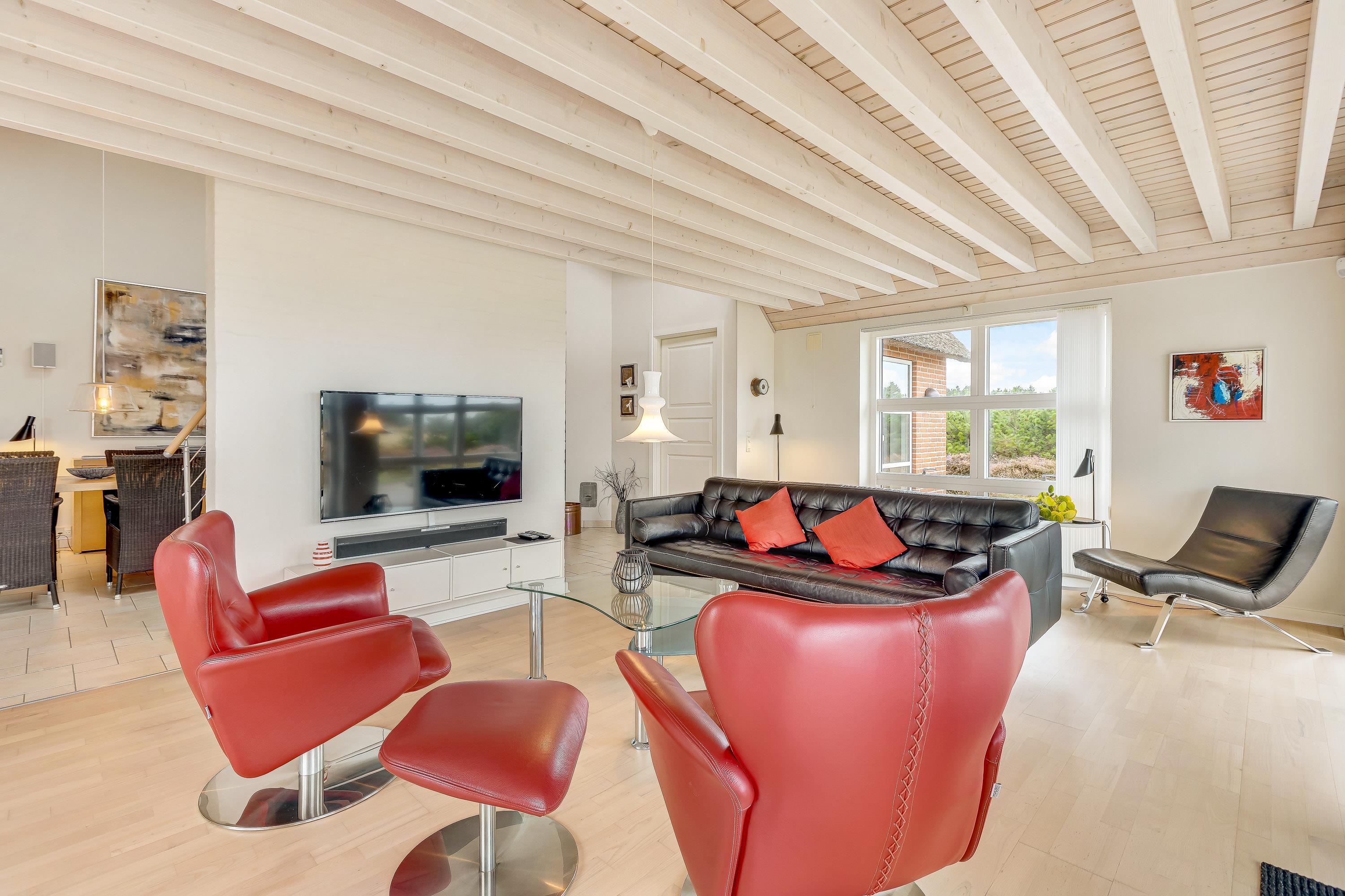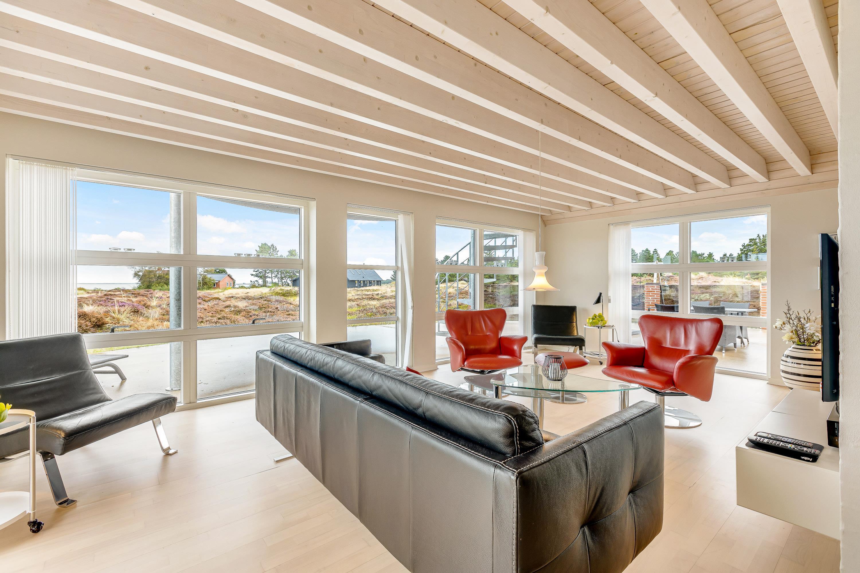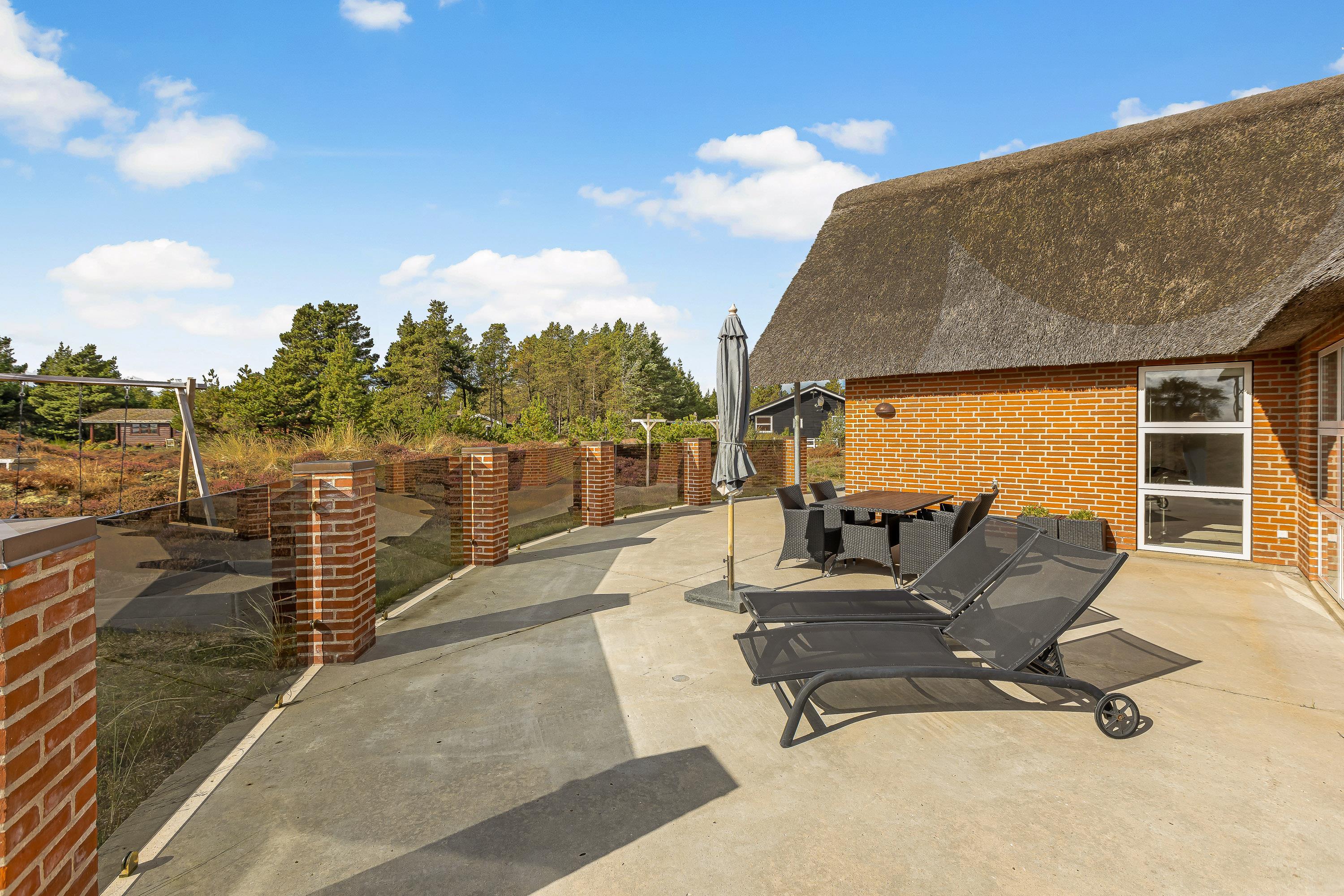 Som et highlight har dette feriehus en hems, hvorfra I har adgang til altanen.Fra terrasse har I den flotteste udsigt over grundens hede og lyng til Vadehavet. Den 2500m² store naturgrund byder på en stor terrasse, hvor I kan tilbringe mange timer sammen. Spis morgenmaden, læs en bog på solvognen og nyd en friskbrygget kop kaffe, mens børnene leger på gynge og i sandkassen.