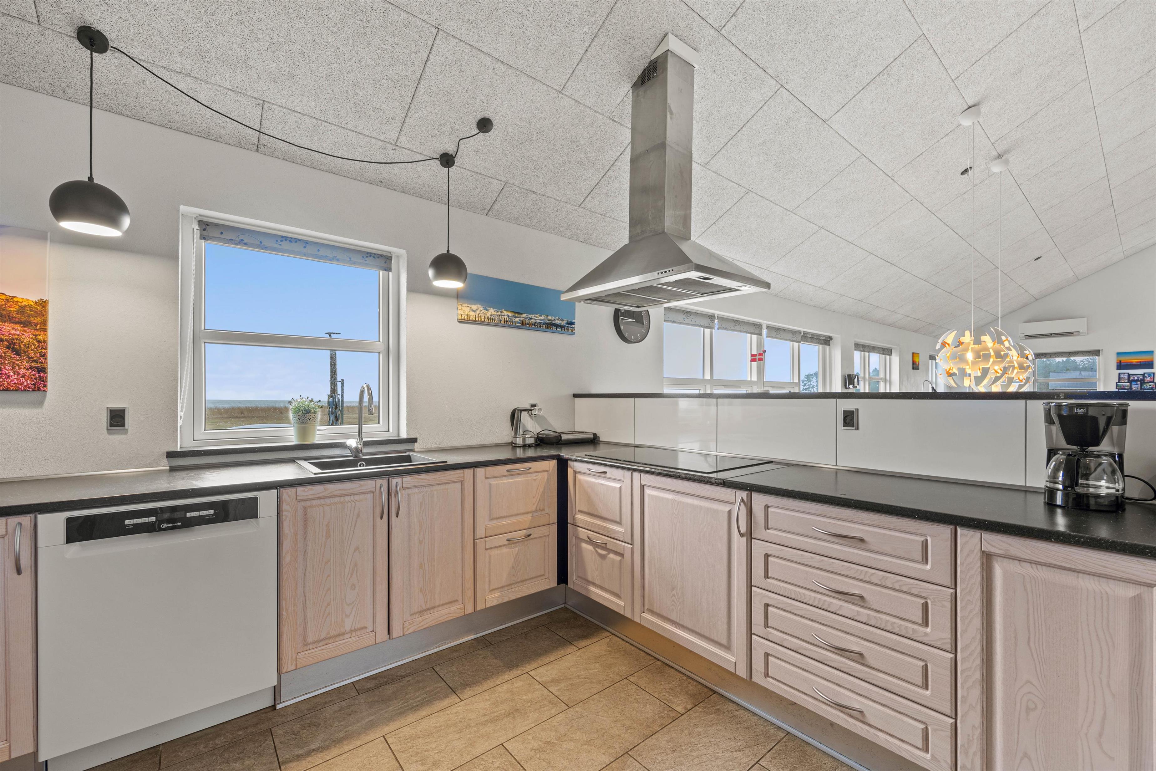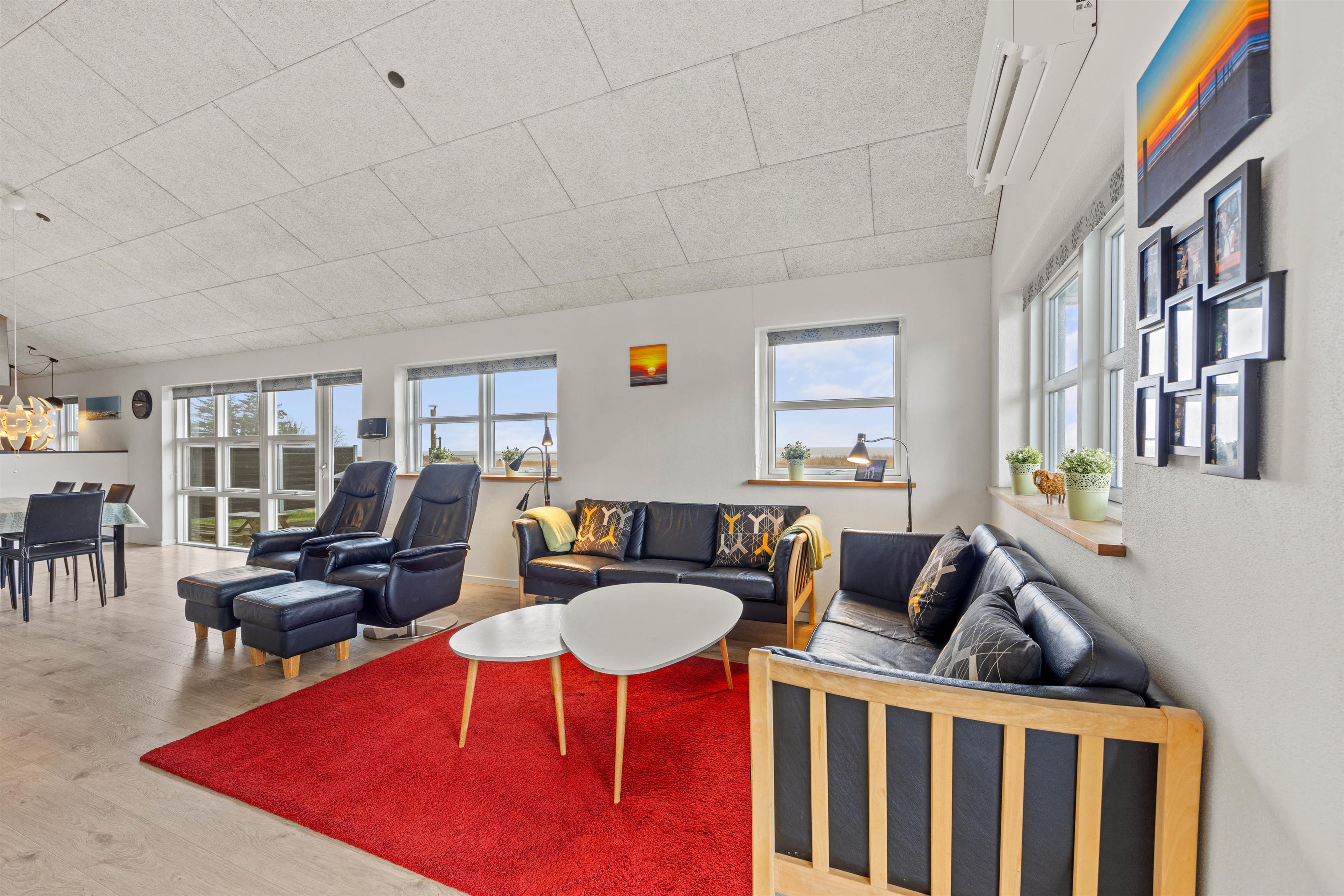 Sommerhusets indretning er moderne og indbydende, og her vil I hurtigt føle jer hjemme. I alrummet kan hele familien samles til madlavning, spisning og afslapning på sofaen. På kølige efterårsdage eller til ekstra hyggelig feriestemning kan I tænde op i brændeovnen, der sætter prikken over i’et til feriestemningen. Der er også en energibesparende varmepumpe i sommerhuset, som I med fordel kan benytte jer af til at holde et behageligt indeklima.
