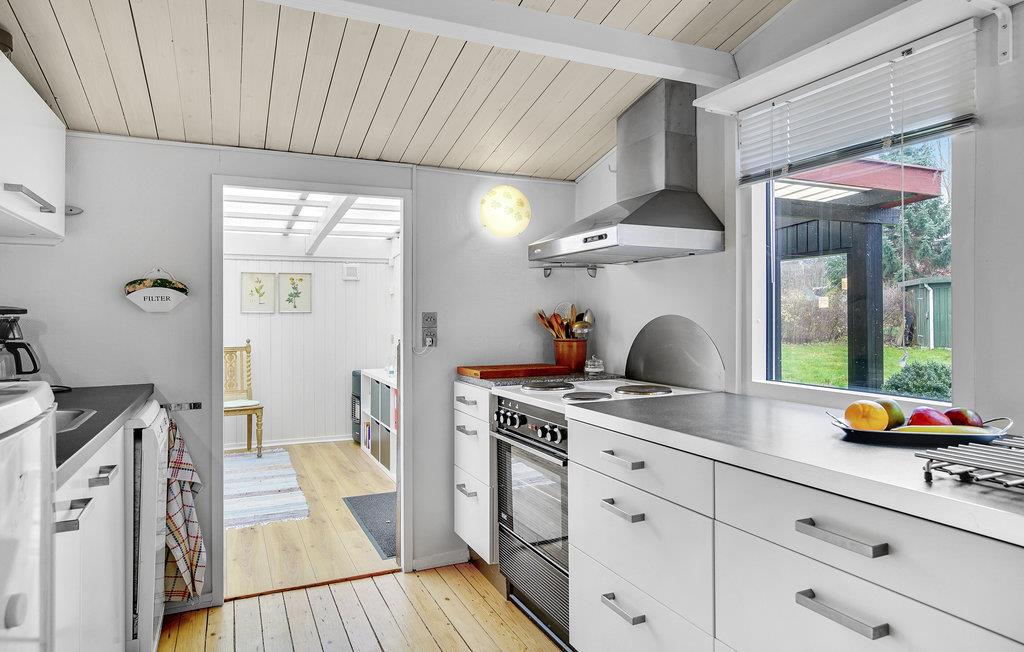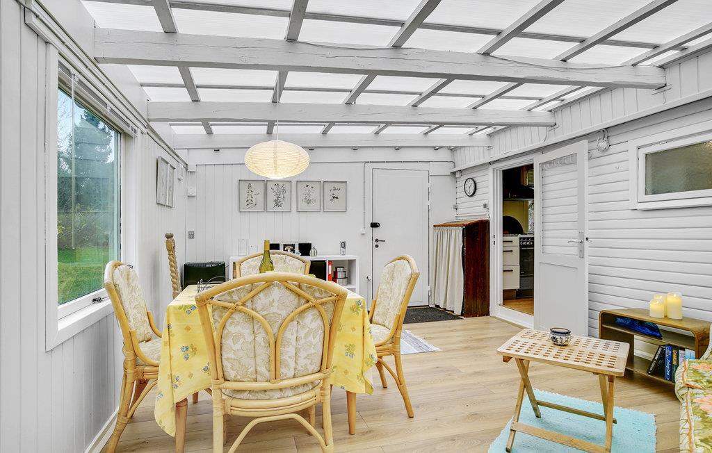 Dette hyggelige feriehus byder dig velkommen til en stor, afsondret grund i grønne omgivelser. Husets hjerte er det kombinerede opholds- og køkkenområde med spiseplads og brændeovn. Her kan du tilbringe afslappende timer med en bog i sofaen eller over middagen. De mange vinduer giver dig masser af dagslys og en smuk udsigt indefra. I udestuen har I ekstra gode rammer til at nyde solstrålerne og udsigten til den grønne have på en kølig dag.