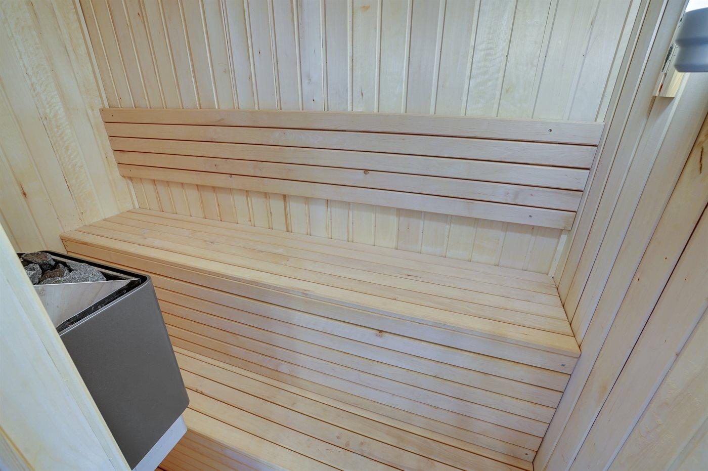 Der er 1 badeværelse med bruseniche og 2 toiletter, heraf 1 gæstetoilet. Der er gulvvarme på 1 badeværelse. Der er gulvvarme på gæstetoilettet. I saunaen er der mulighed for afslapning.