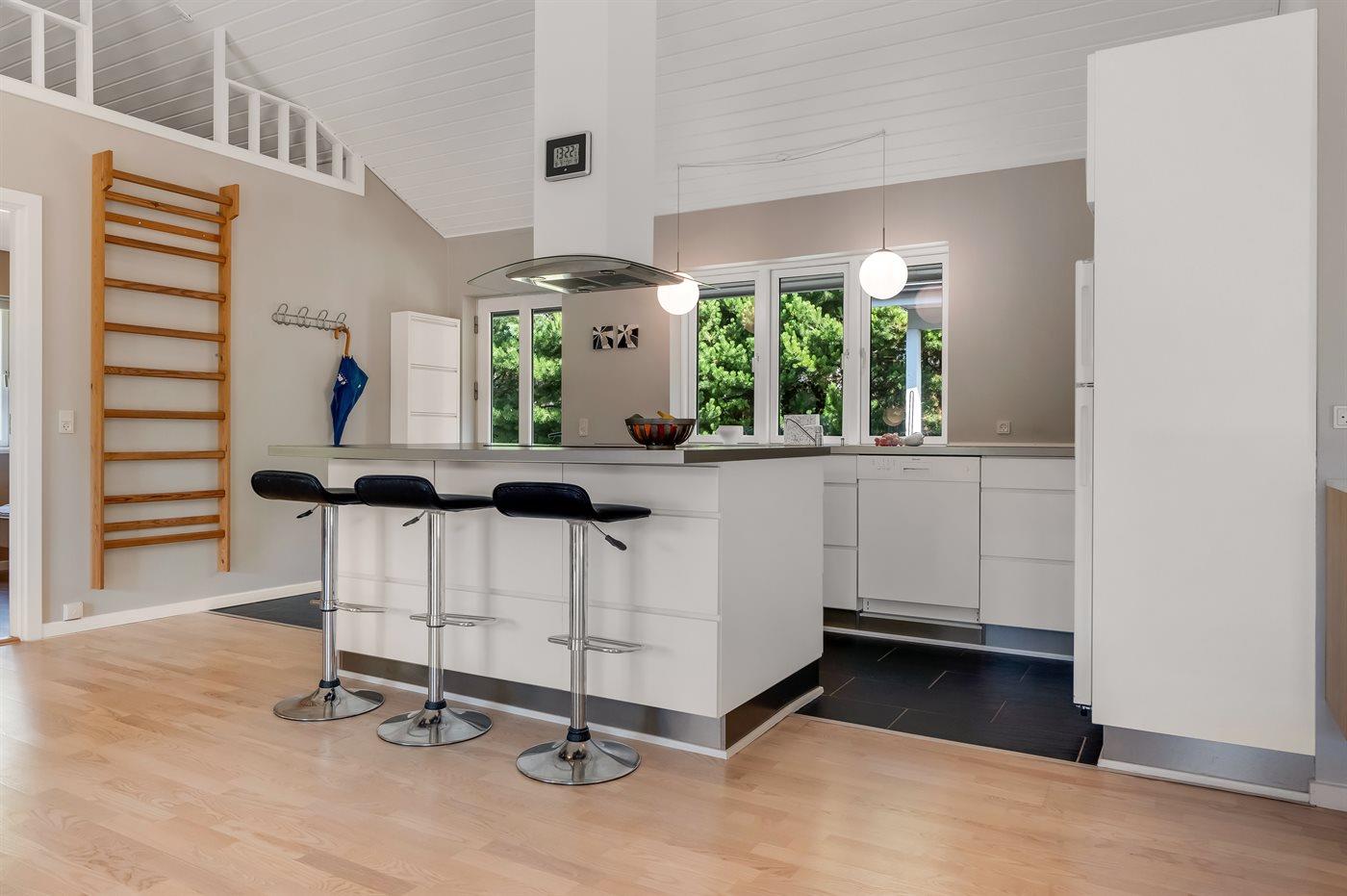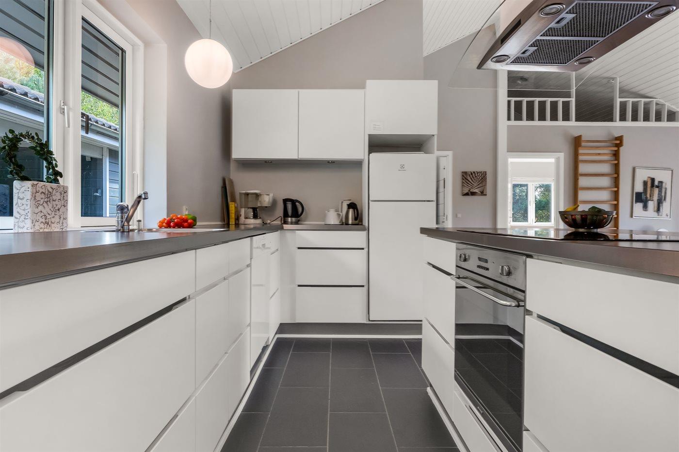 Køkkenet er udstyret med 1 køleskab. Der er 4 induktionskogeplader, varmluftovn, mikrobølgeovn samt opvaskemaskine.