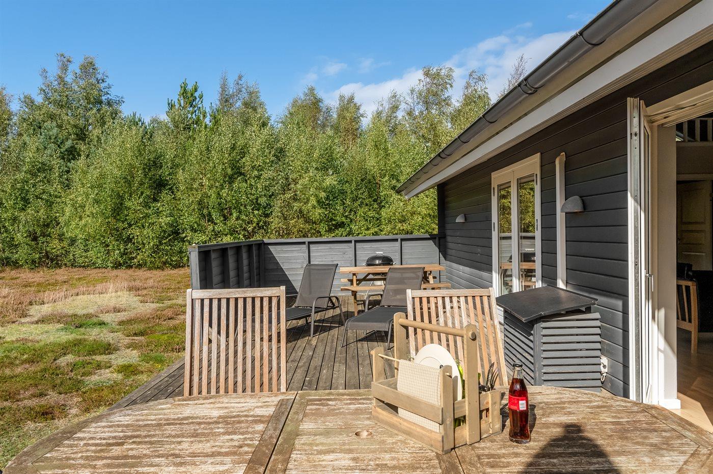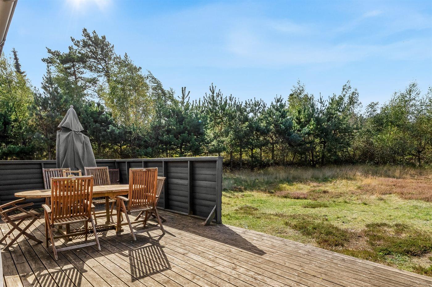 Ferieboligen er beliggende på en 1500 m² stor havegrund. naturgrund. Der er 300 m til havet. Nærmeste forretning er beliggende i en afstand af 700 m. Der er en golfbane i en afstand af 2500 m. Til ferieboligen hører 52 m² terrasseareal. Der er redskabsrum. Der er carport til rådighed. Der er installeret stik til opladning af elbil. Parkering ved ferieboligen.